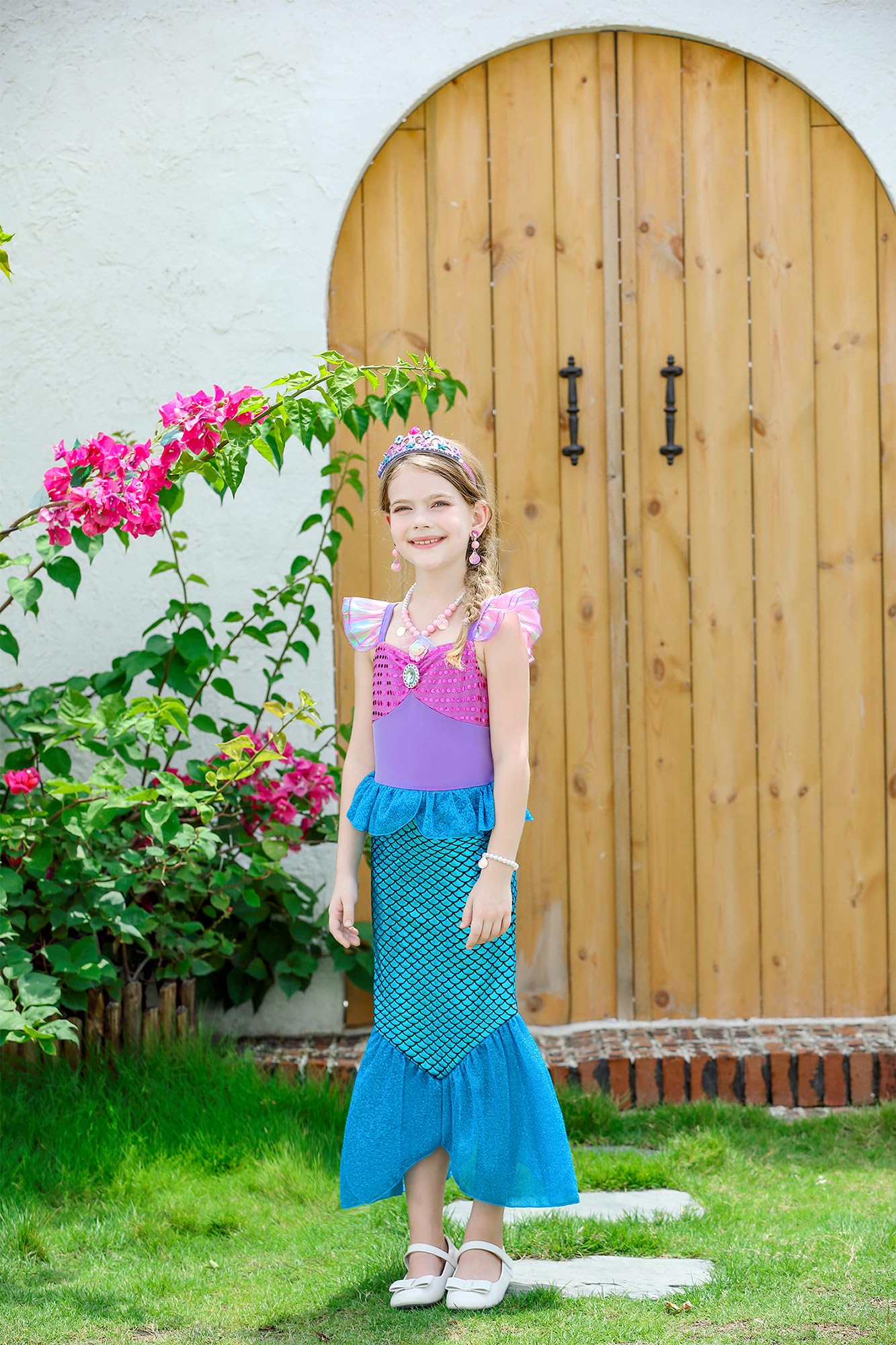 • Q: Does the mermaid costume come with accessories? A: Yes, the costume set includes a mermaid dress, tiara/crown, necklace, bracelet, earrings, a ring, and a mermaid bag, making it a complete dress-up package for your little one.