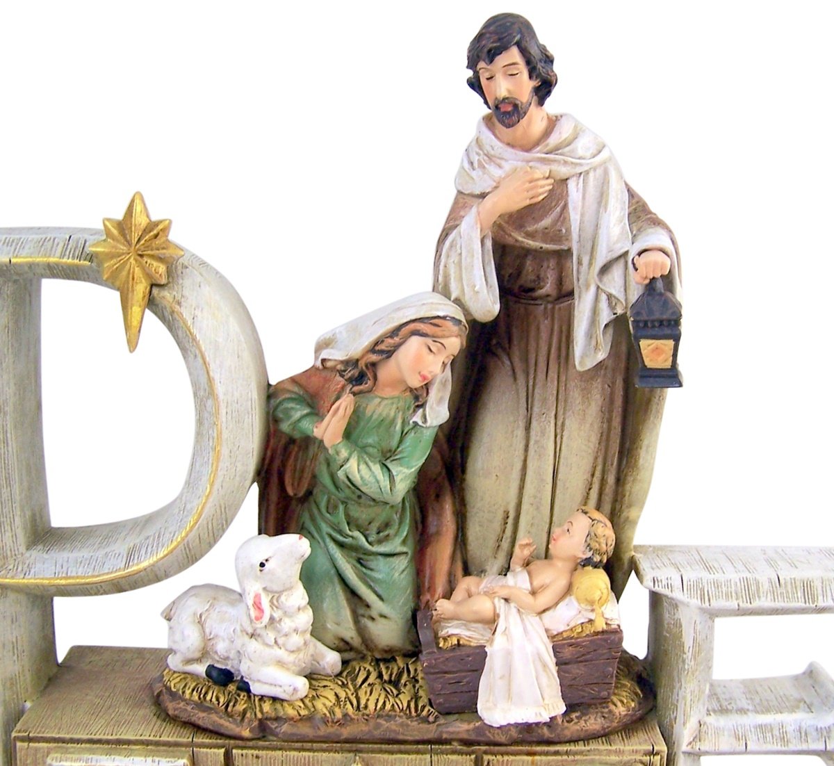 Hand-Sculpted Resin Nativity Scene With Wood Look Features Mary And Joseph Gazing Down Adoringly At The Christ Child While A Sweet Lamb Lays By The Manger And The Star Of Bethlehem Shines Above. Wood Look Blocks Read 'Peace'. Figurine Measures Approximately 9 X 8.25 X 2.25-Inches And Arrives In A Box Ideal For Storage And Suitable For Gifting. Sure To Be A Treasured Piece For Generations. Look For More Exquisitely Detailed Figurines, Plaques And Decor That Celebrate Hope And Christianity From Avalon Gallery At Christian Brands Catholic, A Catholic Owned And Operated Company With A Heritage Rich In Tradition Offering The Finest Selection Of Uplifting Gifts And Décor For Over 60 Years.