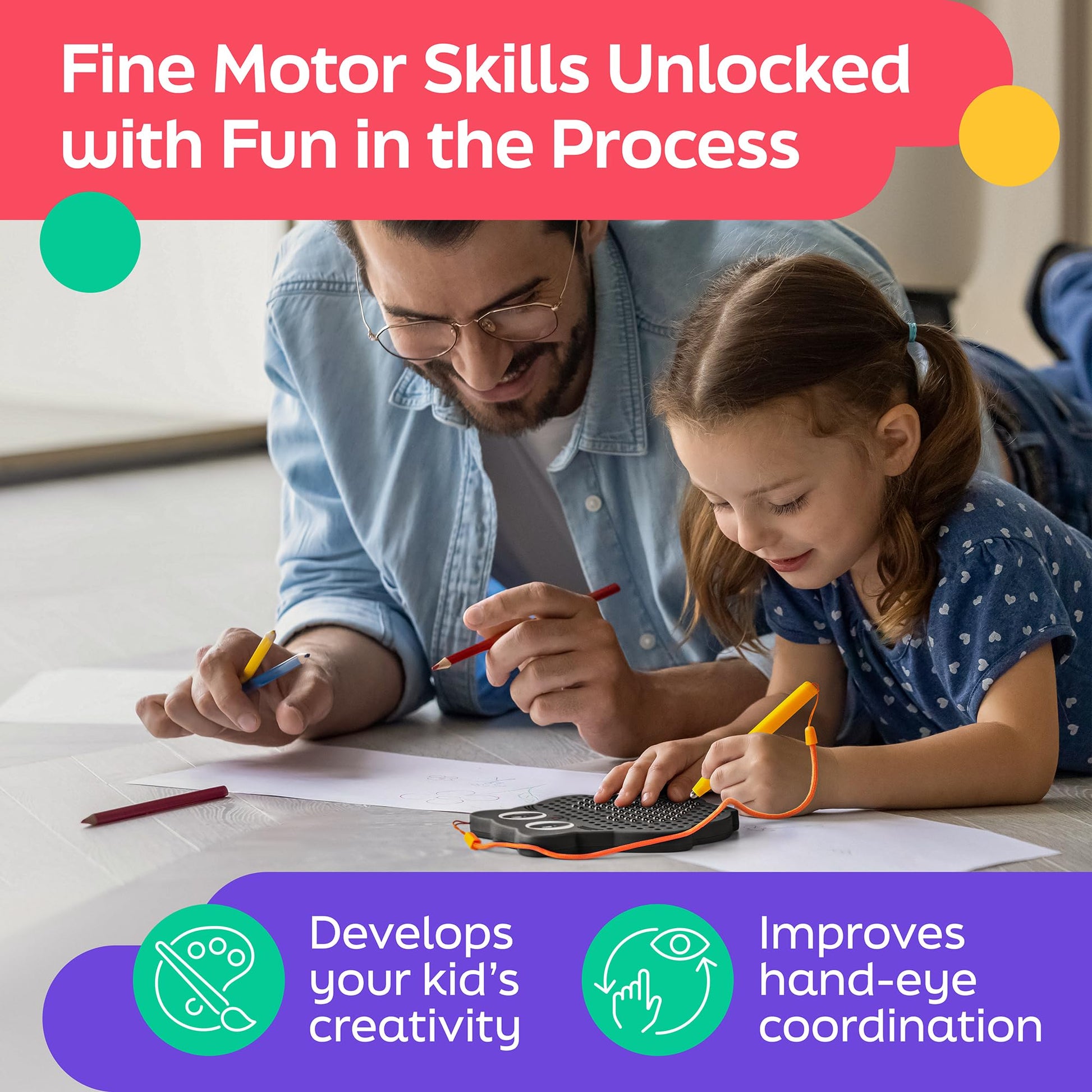 • Q: How does the magnetic drawing board work? A: The magnetic drawing board uses a stylus pen that interacts with magnetic beads beneath the surface. By pointing the nib of the stylus at each hole, kids can move the beads up to create drawings, and to erase their artwork, they simply push the beads back down using the side of the pen.