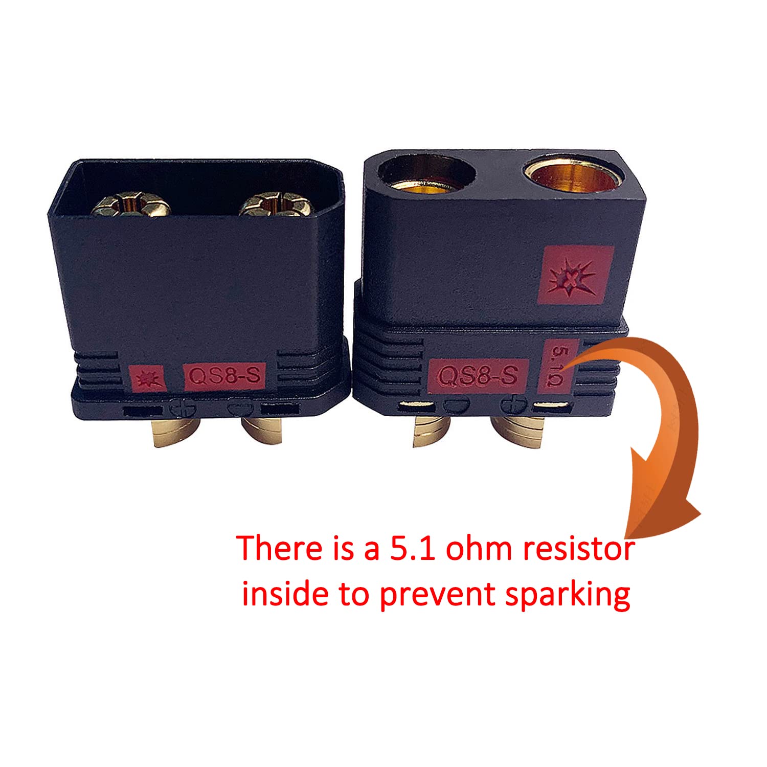 Product Specification *Product Model: QS8 Male and Female Antispark High Current Battery Connector *Shell Material: Nylon With Fiber *Plug Material: Gold Plated Brass *Max Temperature: 200? *Continuous Current: 110A *Max Peak Current: 500A *MAX Wire: 6AWG *Diameter: 8.0mm *Packing: 5 Pairs Why choose us? qs8 connector male & female Plug ( QS8.0mm-S) Set- This system guarantees constant charging of the capacitors on ESC and allows the battery to be connected without S??r?s on your ESC when you first plug in.-The design also provides no chance of incorrect polarity connection. Once soldered up, there are plastic guards that clip on each connector giving you a neatly wired plug and helps prevent short circuits.-These QS8-S heavy Dut? gold plated connectors with built-in antispark.Guaranteed Long Battery Life.