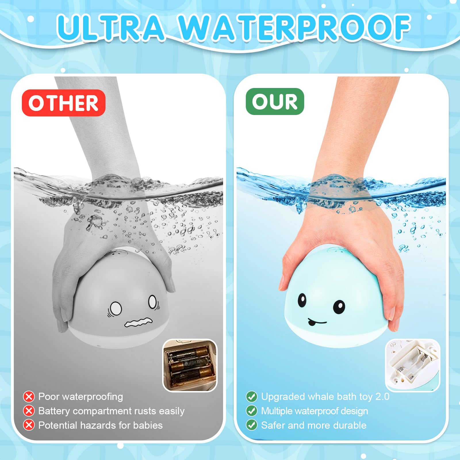 - Upgraded Whale Bath Toy Sprinkler: Our latest model incorporates multiple waterproof designs including a sealed motor, isolation-protected circuit boards, and a waterproof rubber ring, ensuring long-lasting fun without the worry of water damage. Remember to screw on the battery cover tightly to activate the waterproof feature.