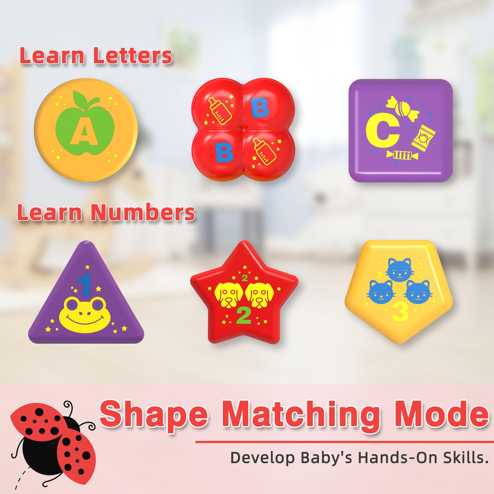 - Q: How does the shape matching feature work in this toy? A: The shape matching feature includes 6 cute shapes that help develop spatial awareness. Babies can press buttons to learn about different shapes while engaging in tummy time play.