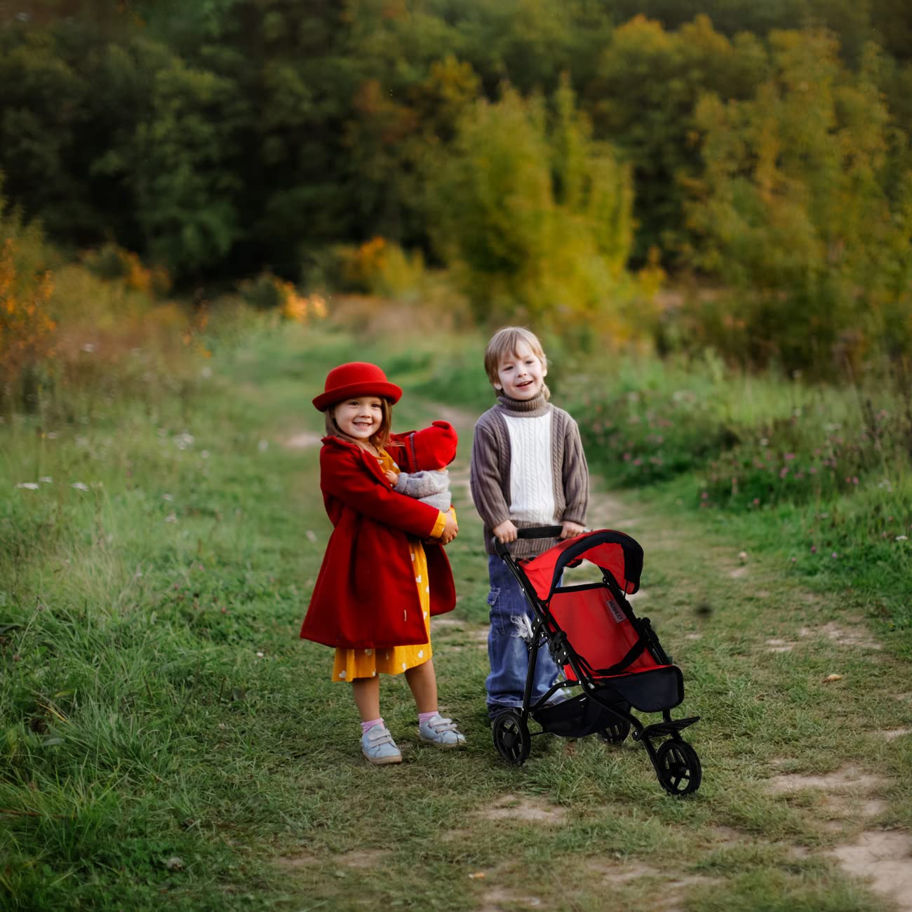 Baby Doll Stroller For Dolls - Jogger Toy Doll Stroller For Toddlers 3 Years And Up, Adjustable Canopy & Storage Basket, Red Design For Kids