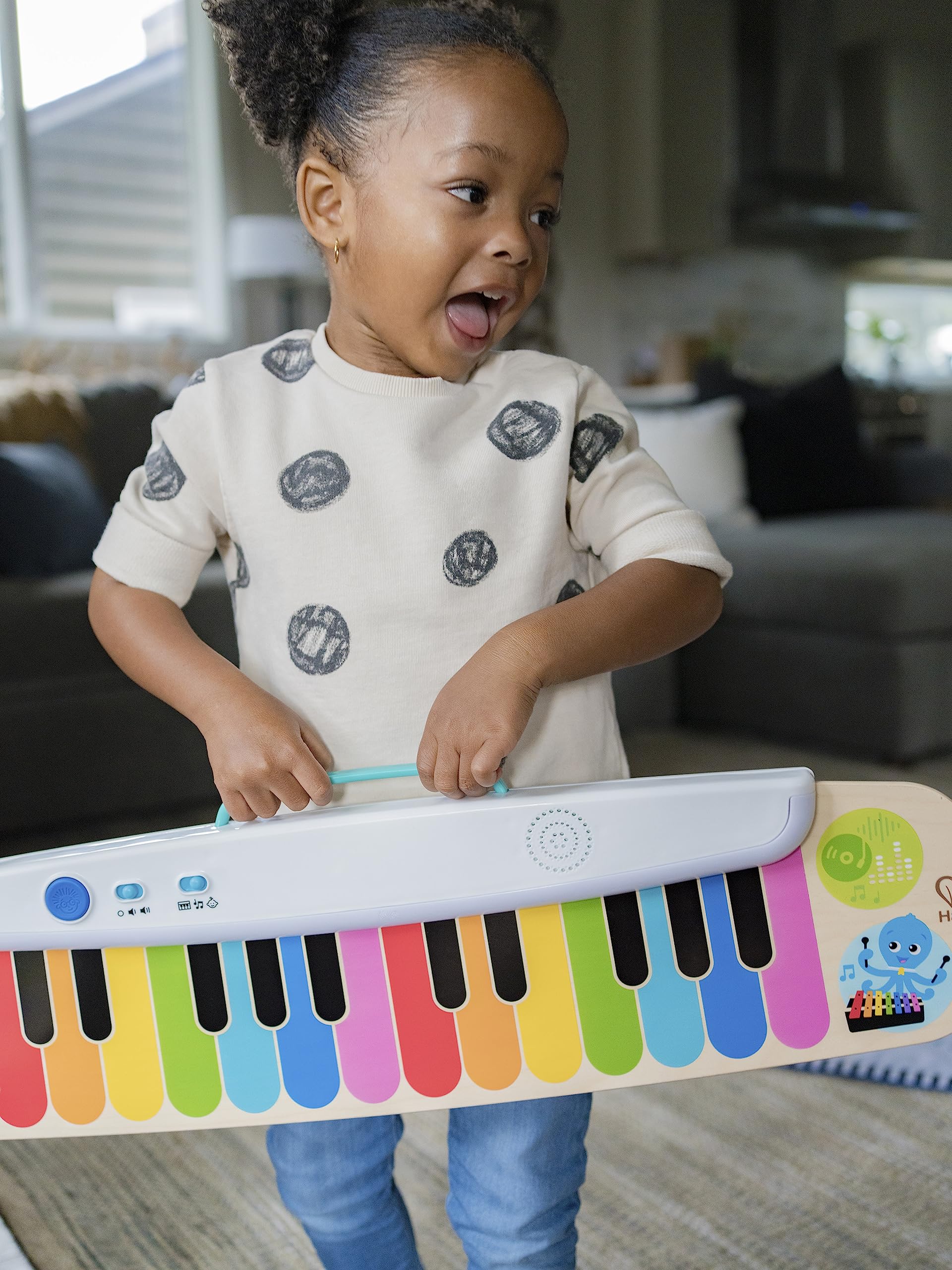 Give baby The keys to music appreciation and creative expression with the notes & keys magic touch keyboard from Baby Einstein. Made with award-winning magic touch technology, This wooden toy puts music at babys fingertips. With no Buttons or keys required! The portable design of this keyboard toy makes it easy to bring Self-Expression wherever you go, and it stows neatly away when not in use. The musical possibilities are endless in free play mode, and baby can switch between piano, xylophone, hip hop and drum sounds. Our play assist technology helps baby discover a new Song by following the lights, and silly mode activates sound effects galore. This developmental toddler toy introduces color and music notes while exploring cause and effect through sound. Your budding musician will be amazed at the way their fingers or toes can make music happen with just a tap!