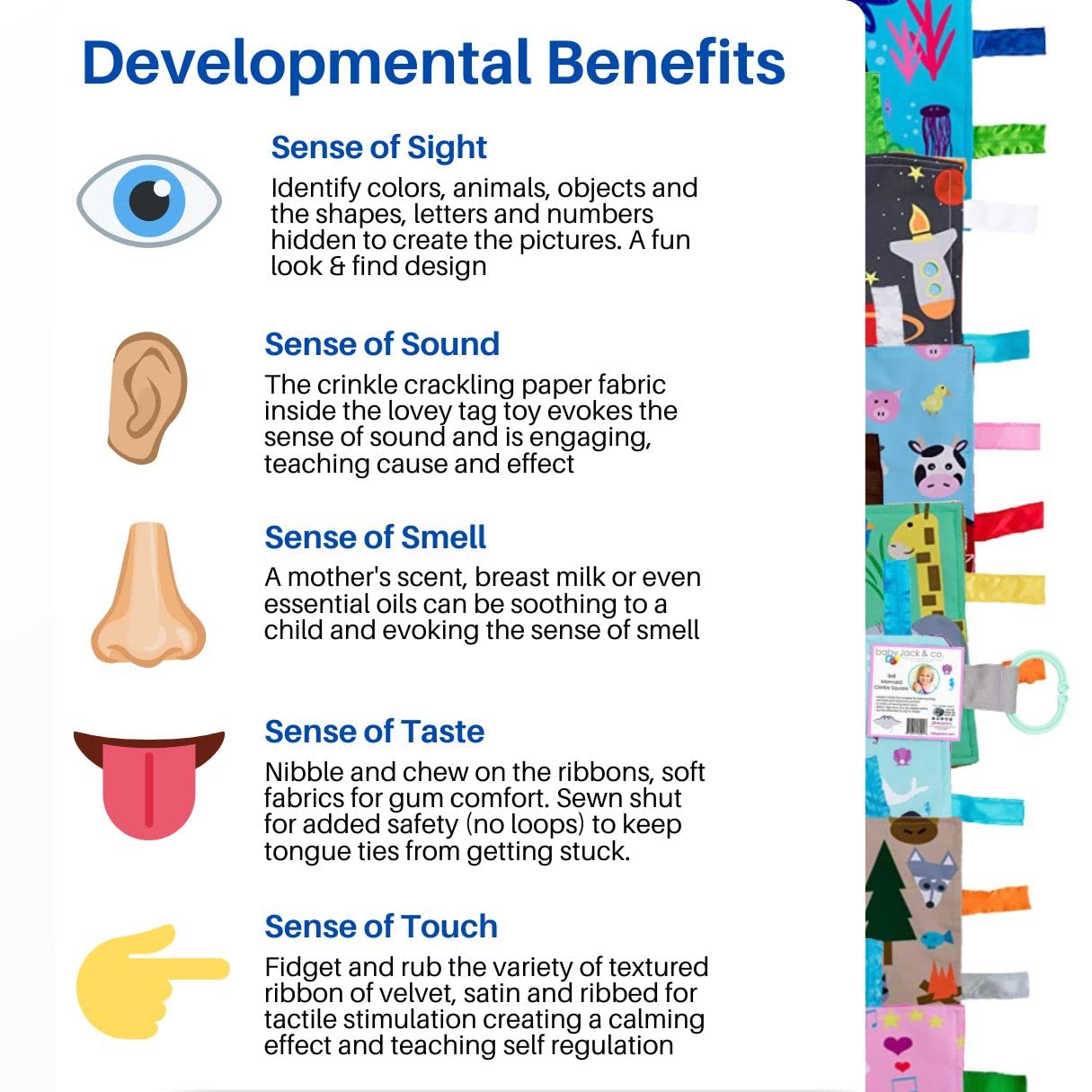 - Q: What are the benefits of using Baby Jack & Co Learning Lovey Tag Toys? A: Baby Jack & Co Learning Lovey Tag Toys promote cognitive, social, and emotional development in babies. They engage all five senses, making them ideal for sensory play and learning.