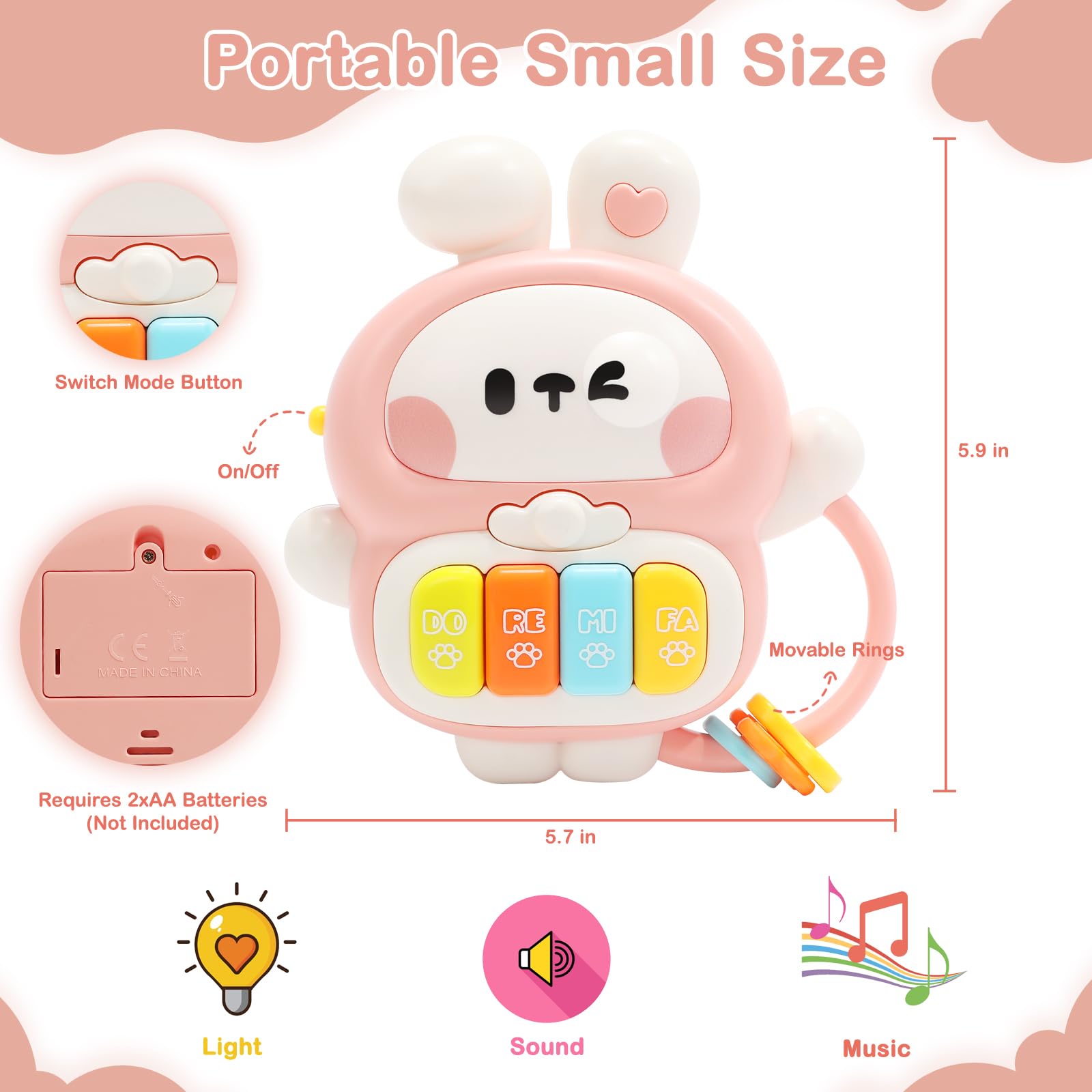 • Q: Can I take the Rabbit Piano on trips or outings? A: Absolutely! The Rabbit Piano is compact and comes with a handle, making it easy to carry around whether you're at home, in the park, or on a long trip.