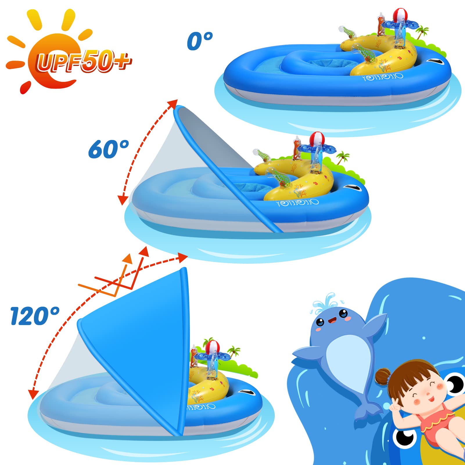 - Q: How does the UPF50+ sun protection feature work? A: The float comes with an adjustable canopy that offers UPF50+ sun protection, shielding your child from harmful UV rays while allowing for breathability and comfort in the sun.