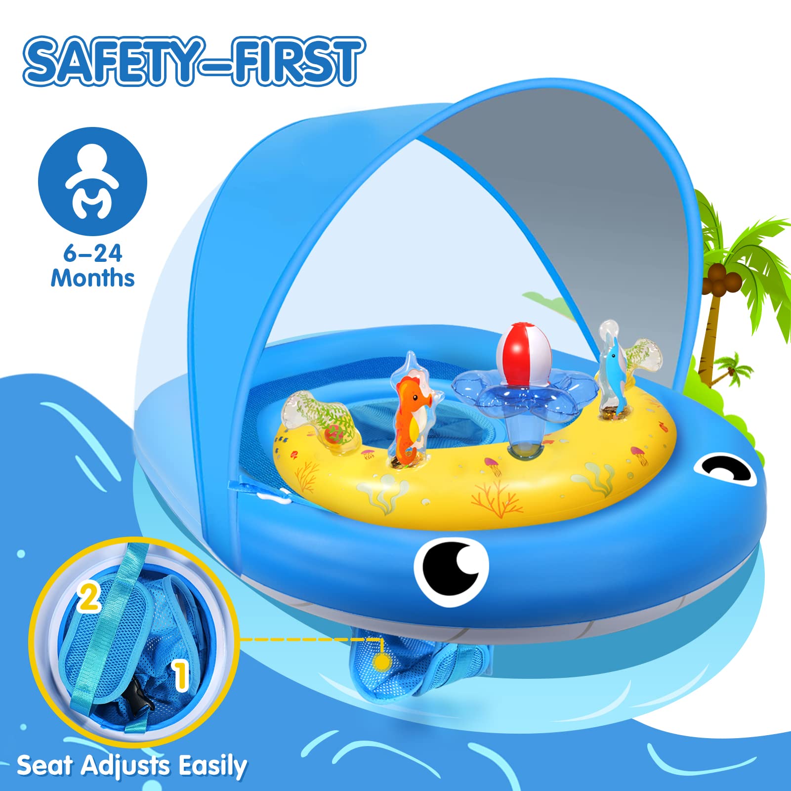 Baby Pool Float With Canopy Upf50+ Sun Protection, 6-24 Months Inflatable Infant Swimming Ring, Bath Floatie, Swimming Pool Accessories, And Toy Play Console With Adjustable Safety Seat