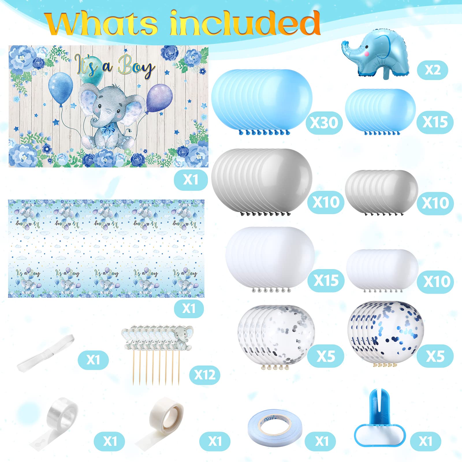 • Q: What items are included in the Baby Shower Party Decorations kit? A: The Baby Shower Party Decorations kit contains a total of 121 pieces, including 1 elephant backdrop, 1 elephant tablecloth, 12 cake toppers, 2 aluminum foil balloons, 100 latex balloons, 1 knotter, 1 roll of glue point dot, 1 roll of ribbon, 1 roll of balloon chain, and 1 rope.