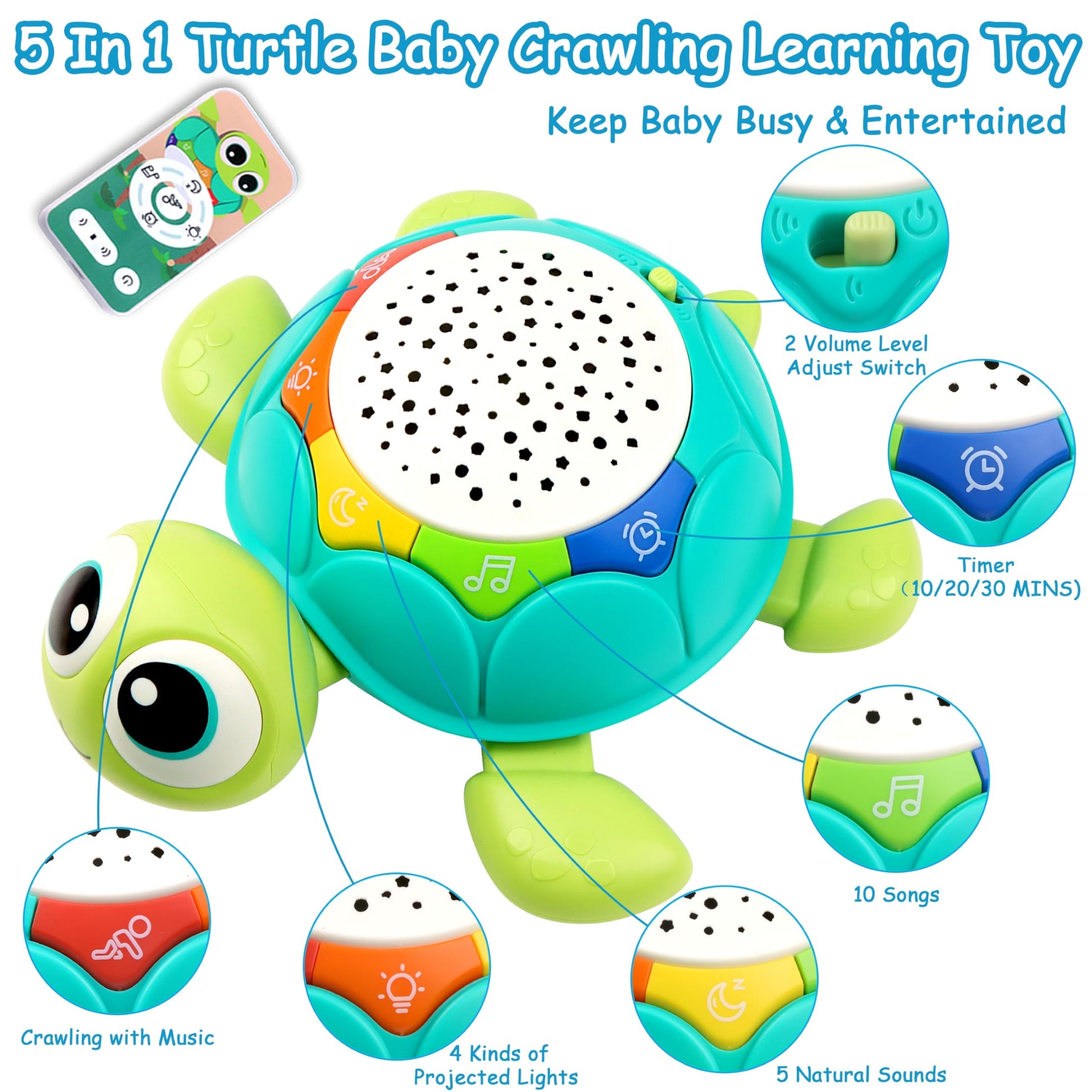 5 In 1 Crawling Baby Musical Toys Perfect Baby Toy That Can Play From Birth As Newborn Toys To Age 2 Years Old As Toddler Toys Age 1-2. This Is A Baby Toys 0-6 6-12 12-18 Months Developmental In Cute Little Turtle Shape. The Baby Musical Toys With 5 Kinds Of Sound And Music Mode. Crawling With Rhythmic Music, Then Babies Will Follow Crawling Or Walking That Have Tummy Time. With Remote Control That Parents Can Control The Baby Toy Through The Remote Control, Play With Baby And Enjoy The Fun Of Parent-Child Interaction. The Best Fun Educational Toy For Your Baby Learning And Crawling.