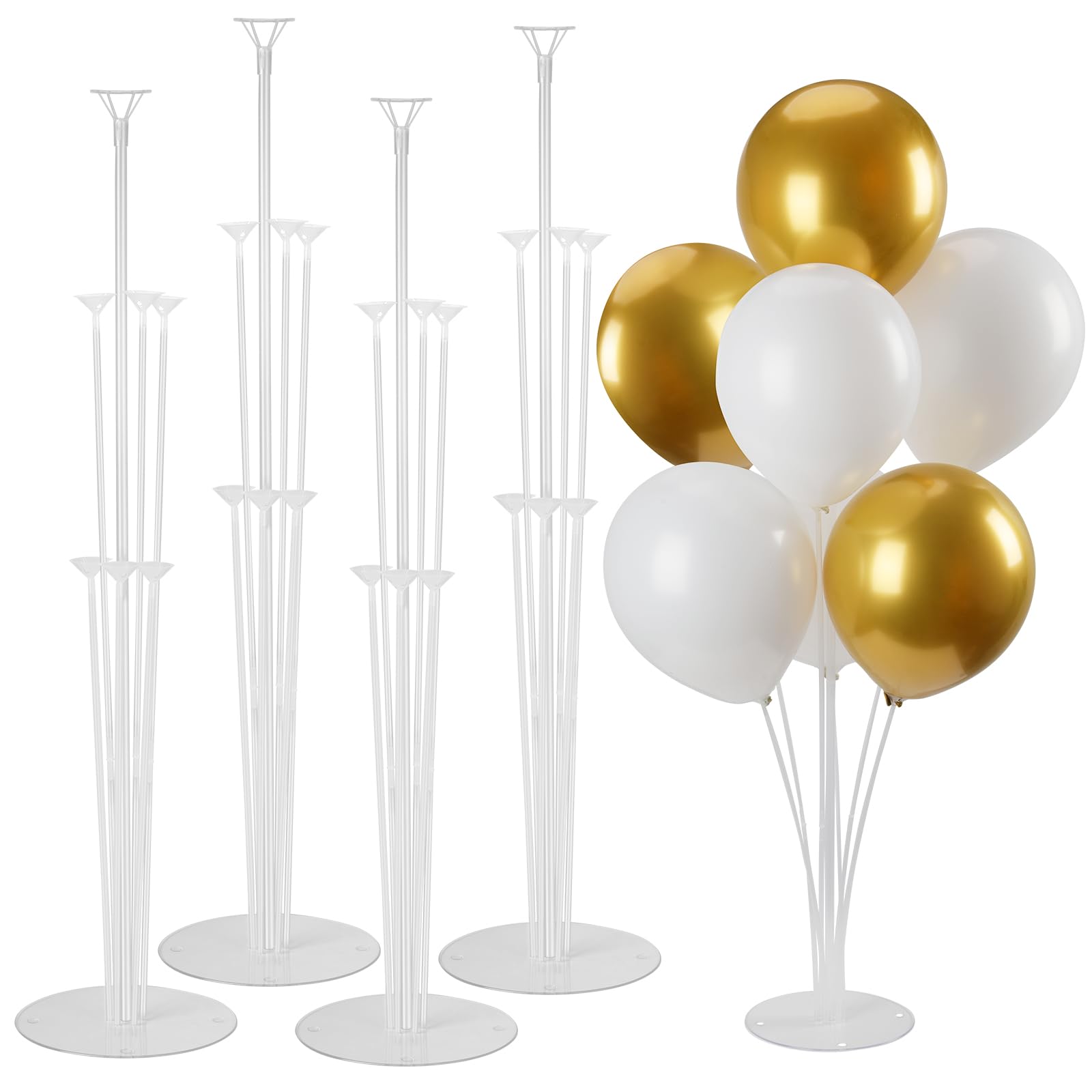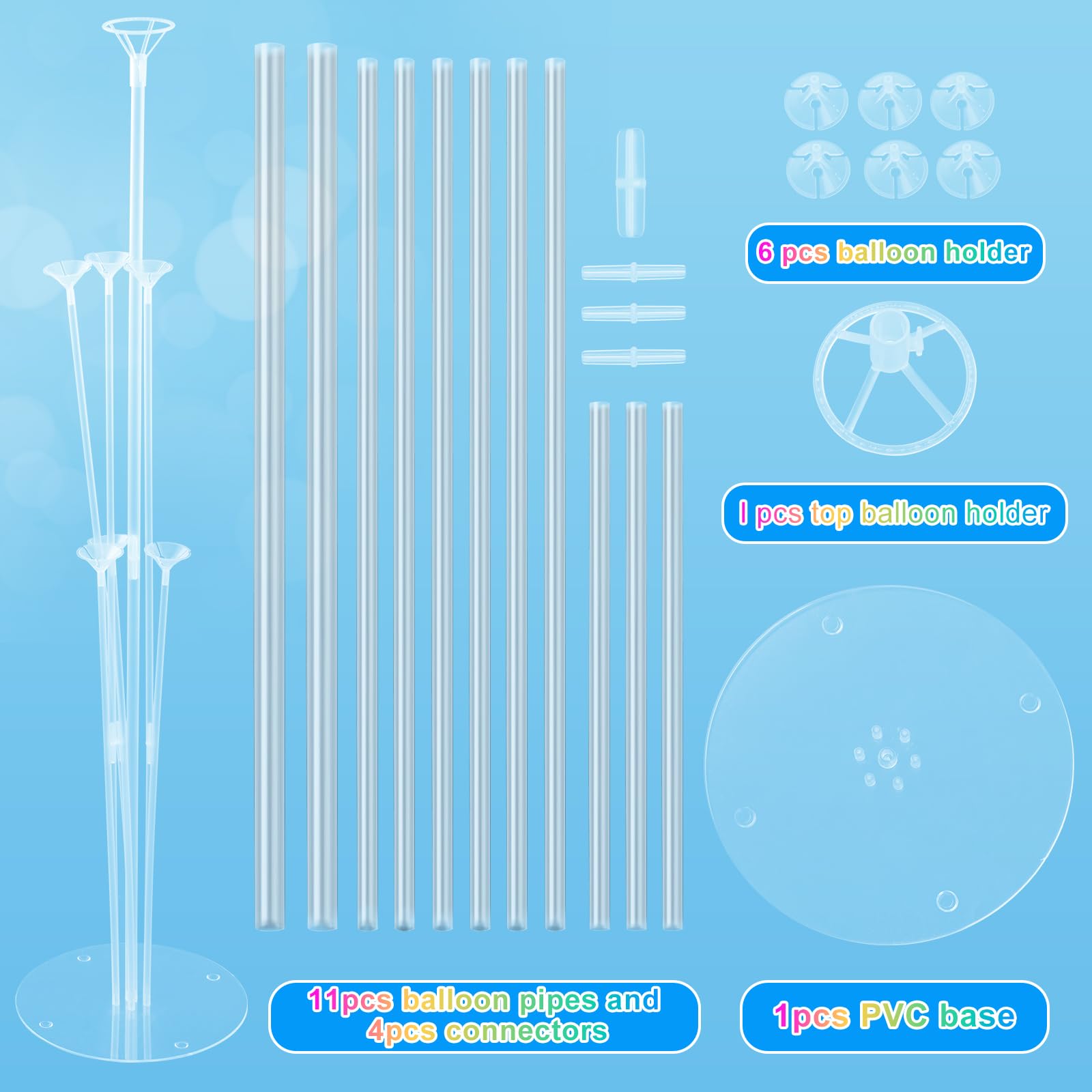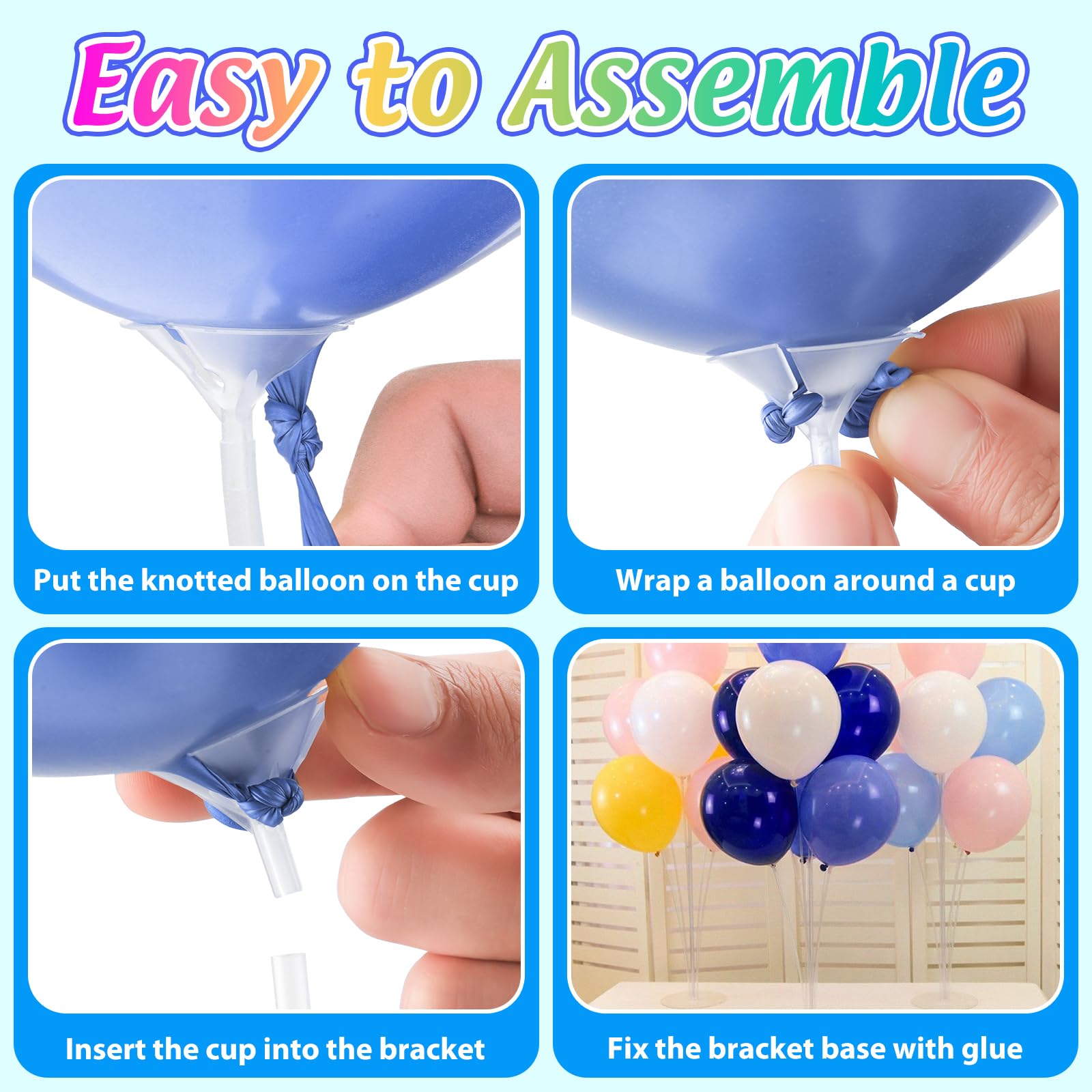 - Q: What is included in the Balloon Stand Kit? A: The Balloon Stand Kit includes 4 sets of table balloon stands, with each set containing 7 cups, 1 base, 4 connection joints, 3 poles measuring 7.9 inches, and 8 poles measuring 13.8 inches. Please note that balloons are not included.