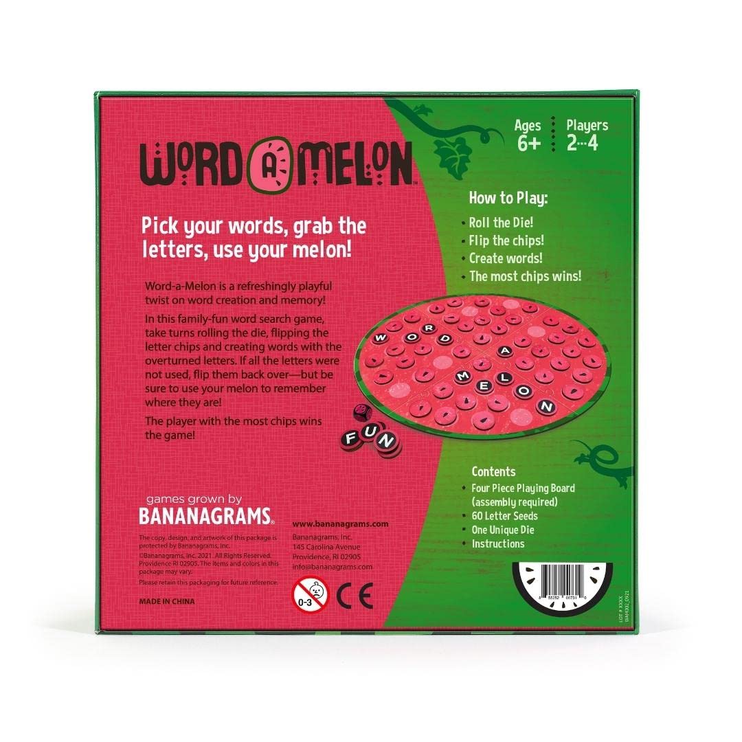 • Q: How do you play the Word-a-Melon game? A: In Word-a-Melon, players take turns rolling a die, flipping over cardboard letter chips, and forming words using the revealed letters. Unused letters are flipped back, so players must remember their positions to succeed.