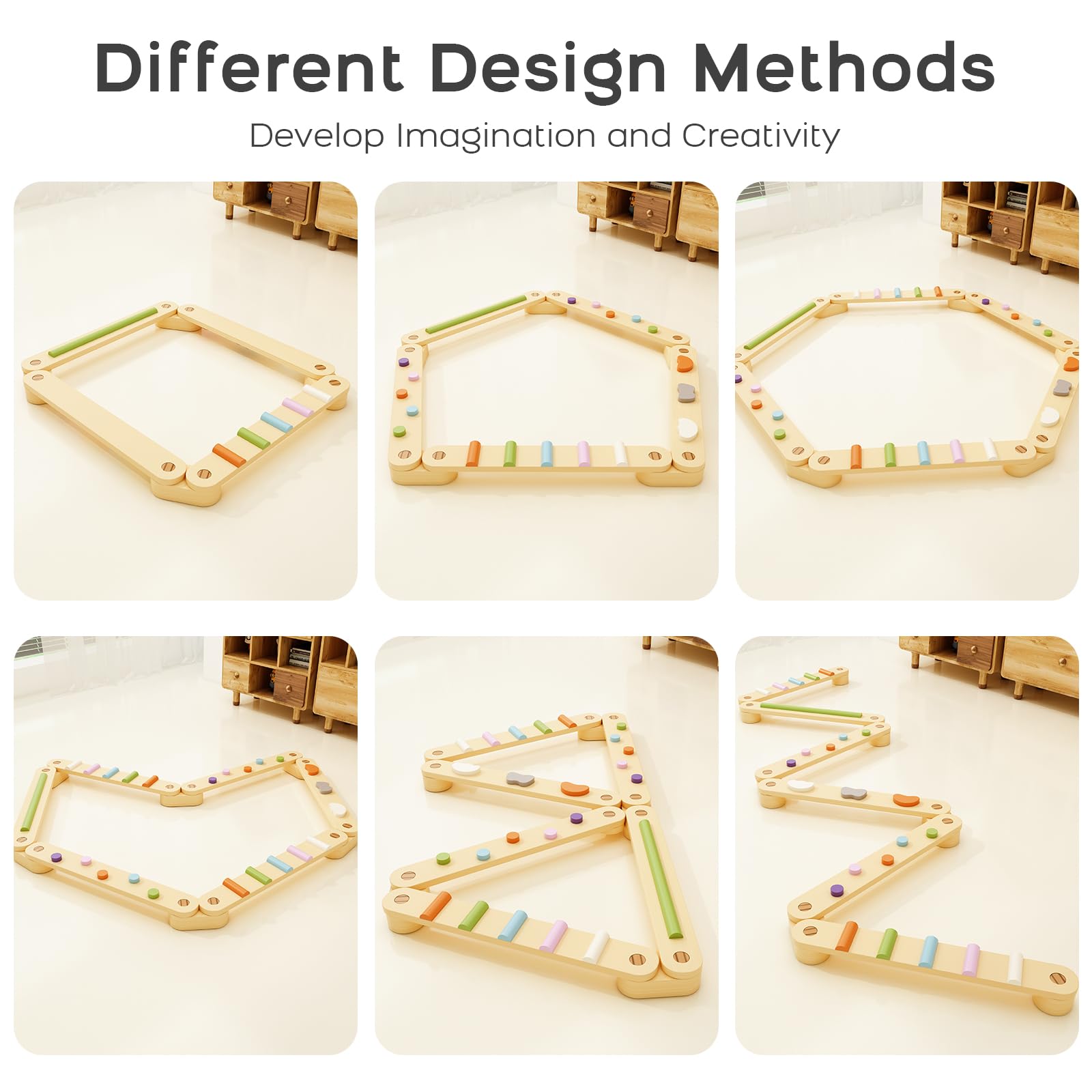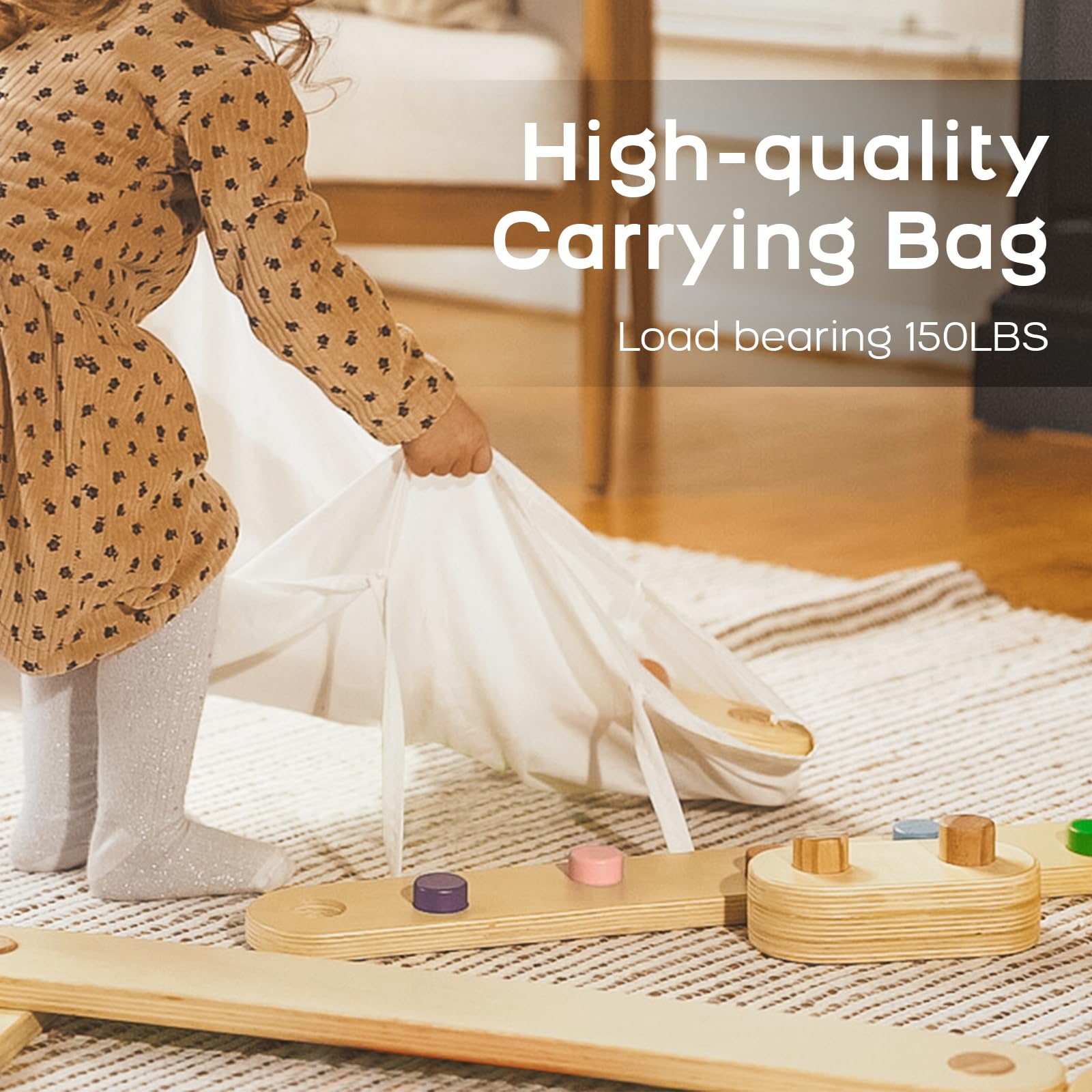 Premium Quality Materials: Our balance beam set is made from premium birch wood, coated with water-based paint and lacquer. It meets stringent US and EU safety standards, ensuring a smooth surface free of burrs for safe play | Versatile Design Options: With 6 balance beams, children can create endless shapes-straight, zig-zagged, or polygonal-unleashing their imagination and creativity | Developing Balance and Coordination: This wooden balance beam set is an ideal toy for promoting balance and coordination. It strengthens muscles, releases energy, enhances concentration, and builds confidence, making it a perfect bonding experience for parents and children | Unique & Colorful Features: The double-sided design features a flat side and a side with colorful stepping stones, stimulating foot soles and enhancing balance. The vibrant colors also aid in developing color recognition skills | Wide Range of Applications: Each set includes a high-quality carrying bag for convenient transport and storage. Suitable for indoor or outdoor use, it helps kids improve balance and coordination skills | Dimension: Beam*6: 29.13''*3.54''*0.79''; Double Head Connector*6: 7.08''*3.54''*1.58''; Round Connector*2: F3.54''*1.58''. Each beam has been tested to support up to 150lbs