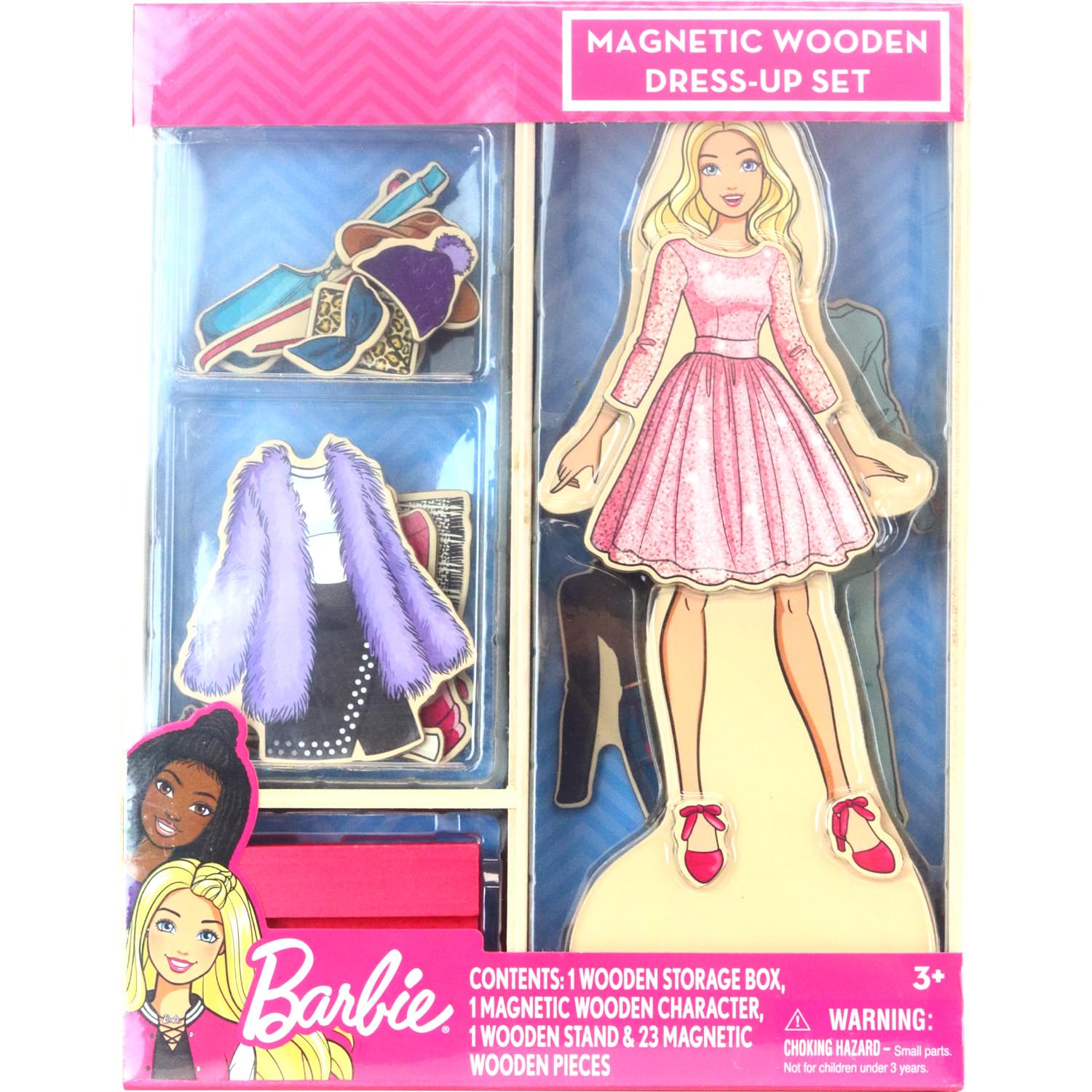 - Q: How many outfits and accessories are included in the set? A: The Barbie Magnetic Wooden Dress Up set includes a total of 23 magnetic wooden outfits and accessories that kids can mix and match.