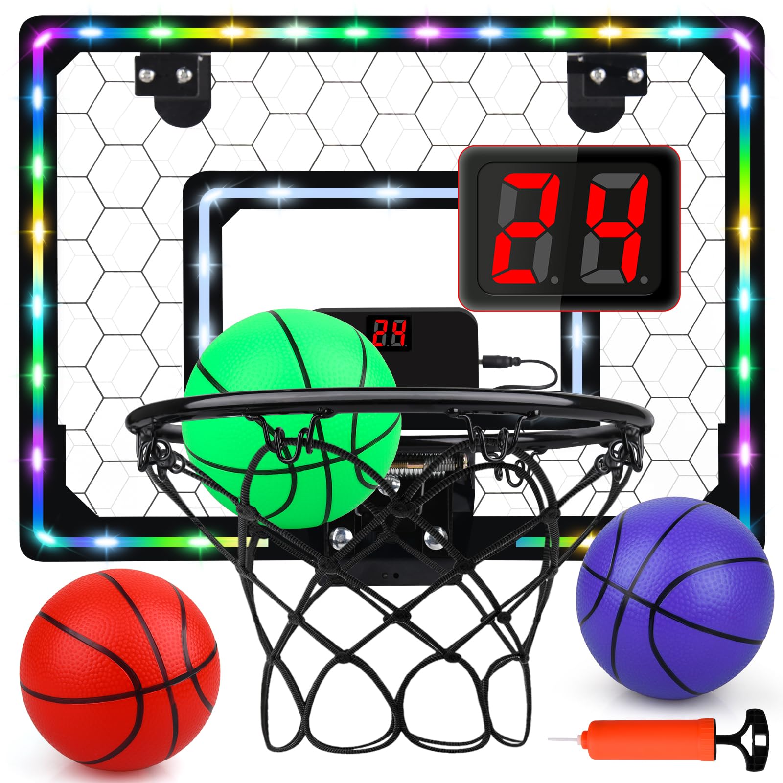 View compareBasketball Hoop Indoor,Mini Hoop With Led Light/Scoreboard, Door Basketball Hoop Basketball Toys Gifts For 5 6 7 8 9 10 11 12 Year Old Boys Girls (Honeycomb Pattern)