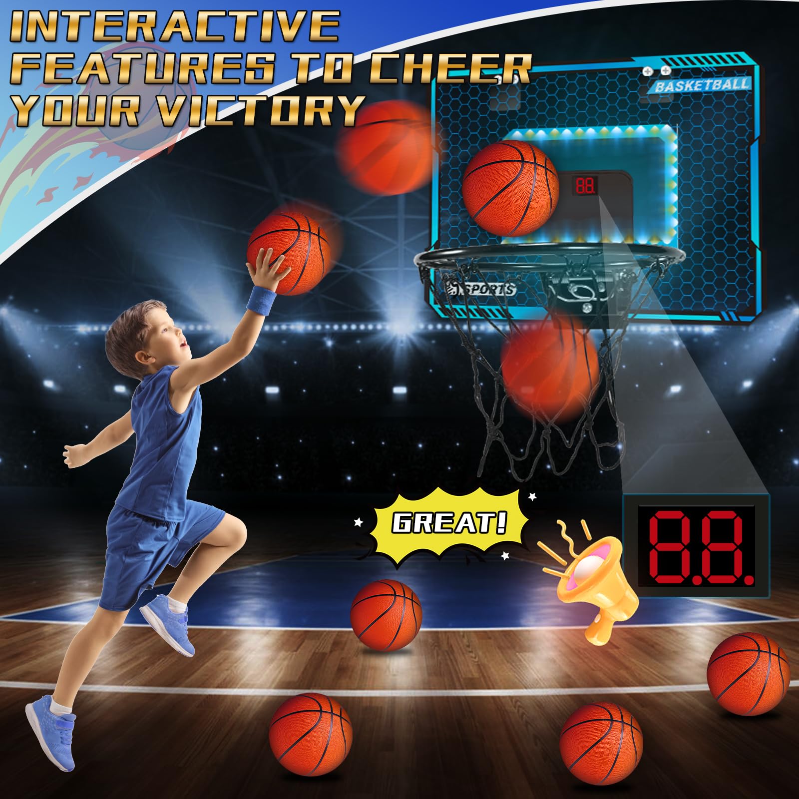 Basketball Hoop Indoor With Led Lights, Basketball Toys Gifts For 5 6 7 8 9 10+ Year Old Boys Kids, Indoor Over The Door Mini Basketball Hoops With Electronic Scoreboard & 3 Balls