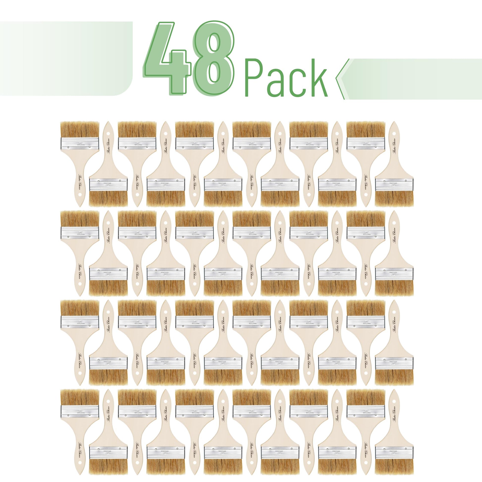 Bates chip paint brushes set includes 48 brushes, perfect for handling large painting projects and providing precise coverage. Made with natural bristles, these brushes deliver smooth, even application and are ideal for both detailed work and broader surface areas. Each brush is 4 inches wide, making it the perfect size for larger surfaces and quick, efficient coverage. The durable wood handle ensures a comfortable and firm grip, reducing fatigue during long painting sessions. Ideal for both professionals and DIY enthusiasts, this bulk pack provides an excellent, cost-effective solution for all your painting needs.