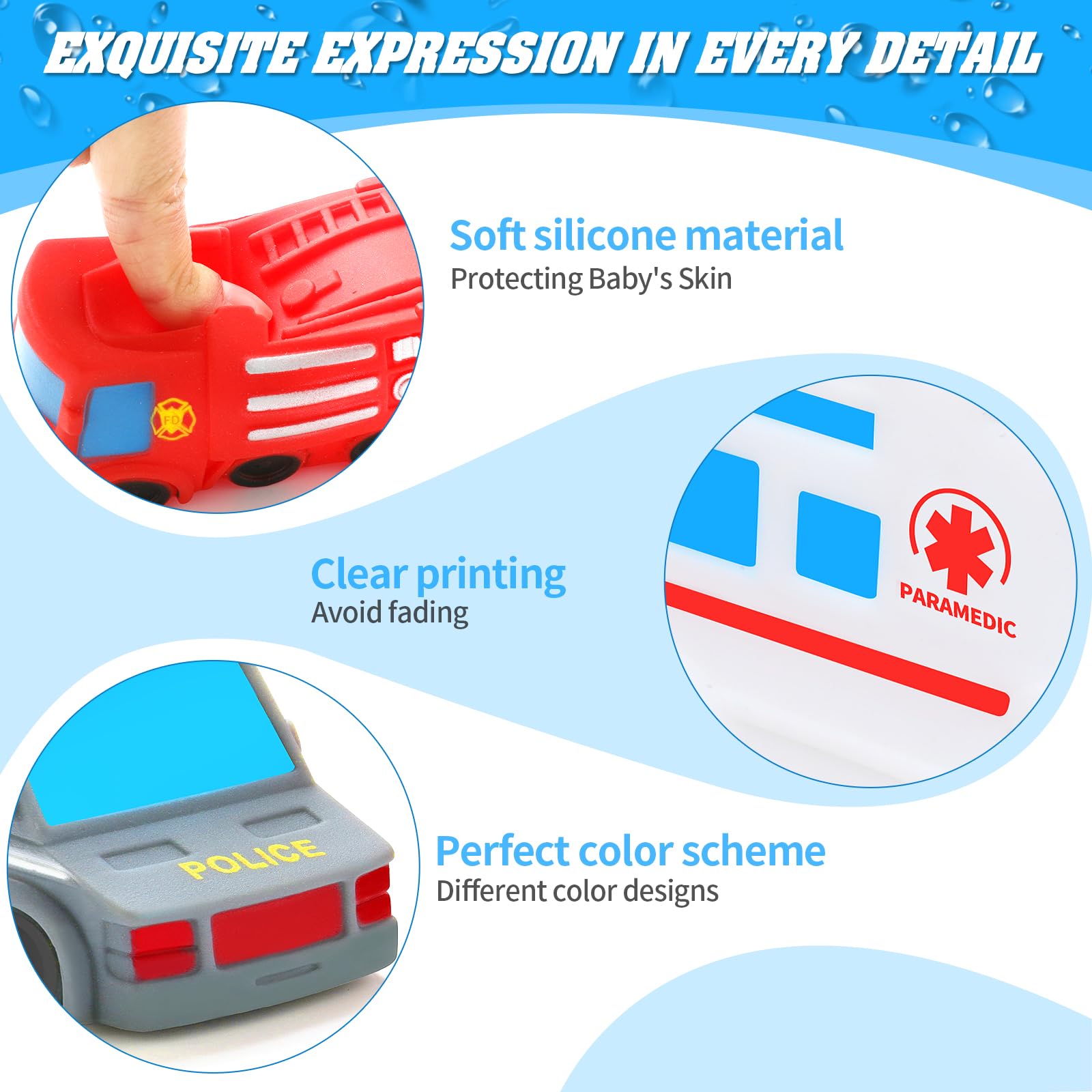 - Q: What types of vehicles are included in the toy set? A: The set includes three exciting vehicles: a fire truck, a police car, and an ambulance, encouraging imaginative play and educational exploration during bath time.
