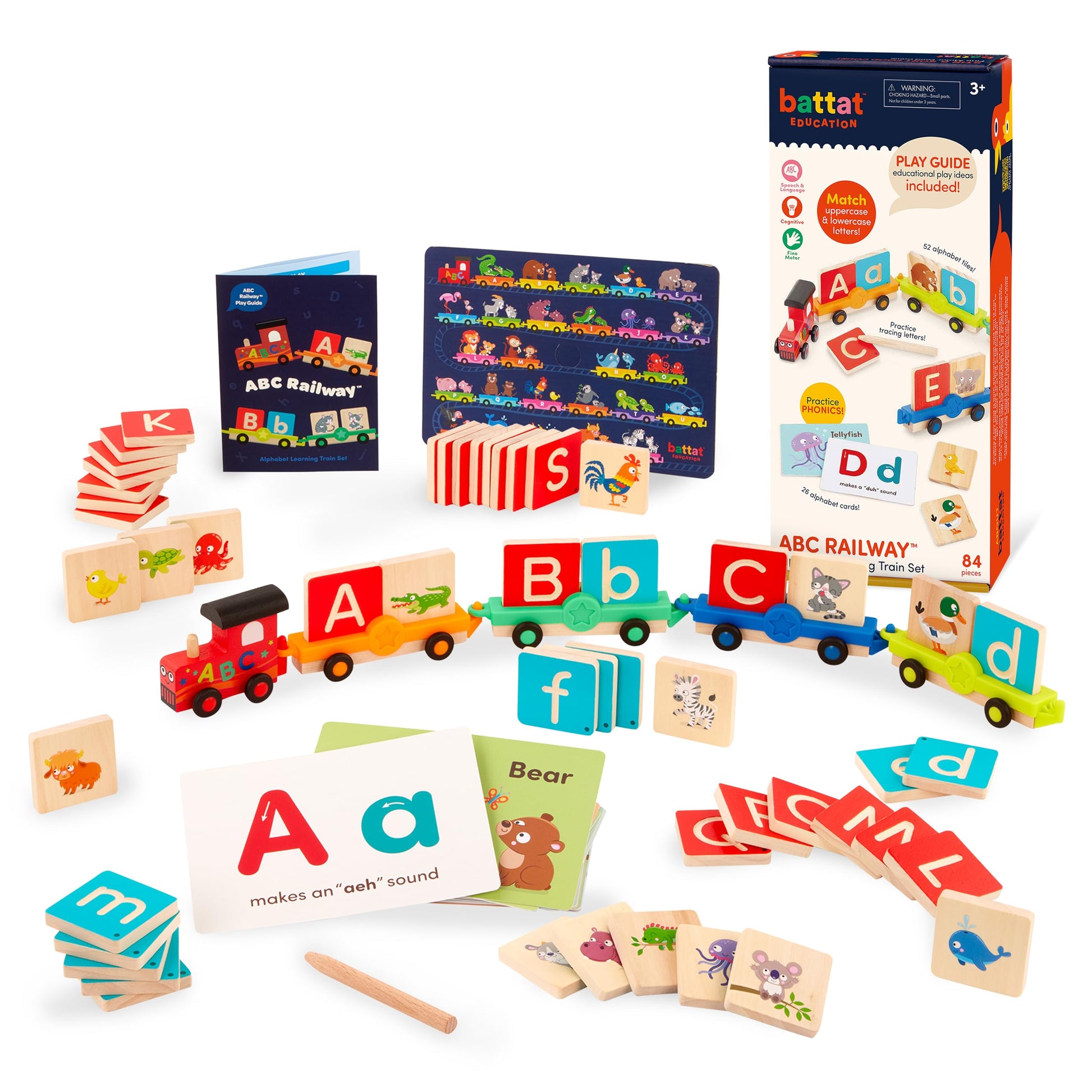 - Q: How many pieces are included in the Battat Alphabet Train Set? A: The set includes a total of 84 pieces, which consist of 5 train pieces, 52 wooden alphabet tiles (26 uppercase and 26 lowercase), 26 alphabet cards, and 1 wooden stylus.