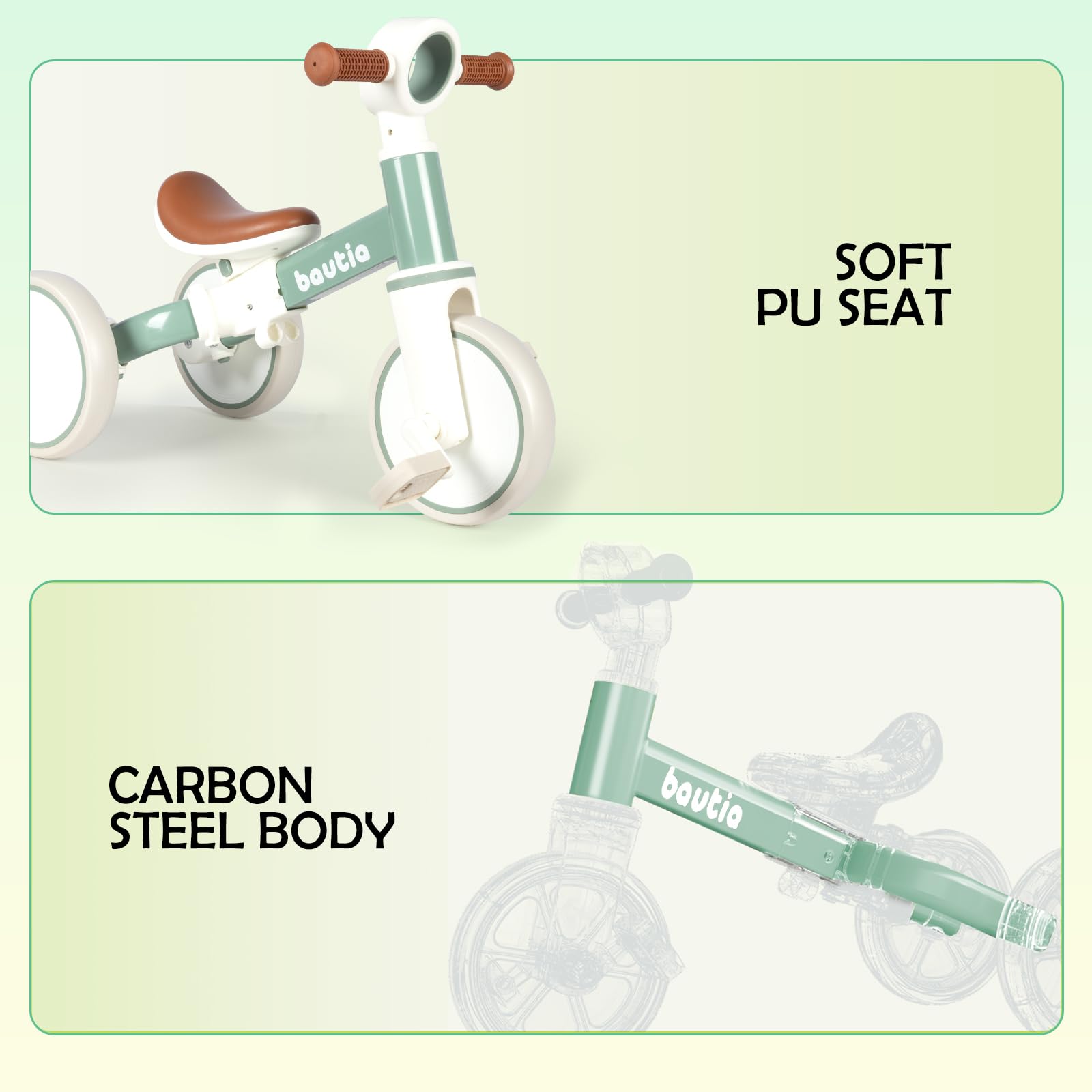 • Q: What material is the BAUTIA Tricycle made of? A: The BAUTIA Tricycle features a sturdy carbon steel body, ensuring durability and longevity. It is also equipped with EVA foam wheels that are designed for both indoor and outdoor use.