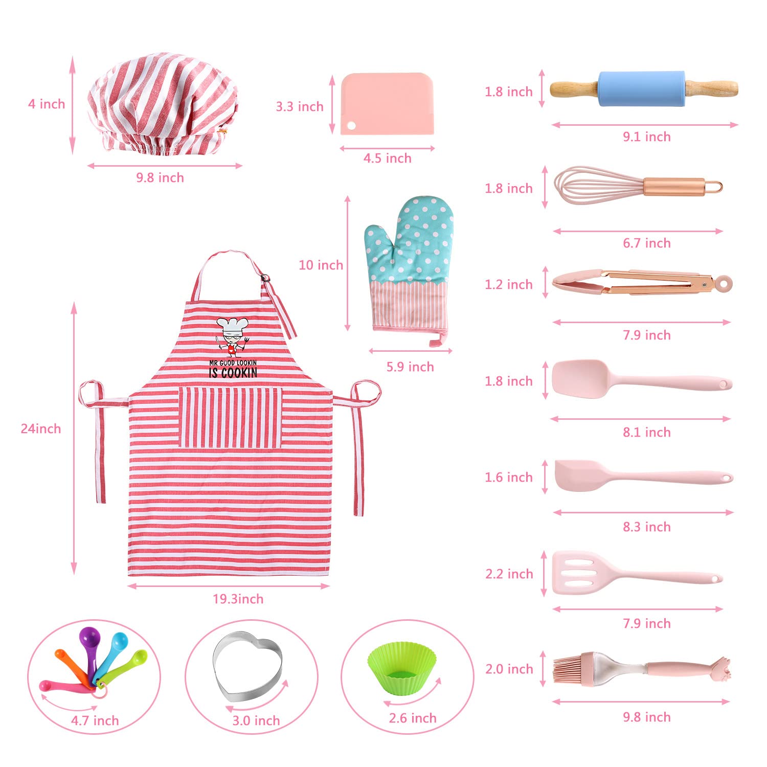 - Q: What items are included in the 38-piece kids baking set? A: The set includes an apron, chef hat, oven mitts, cookie cutters, silicone cupcake molds, measuring spoons, cake cutters, a whisk, brush, tongs, frying spatula, large and small jar spatulas, and a rolling pin, providing everything needed for an engaging cooking experience.