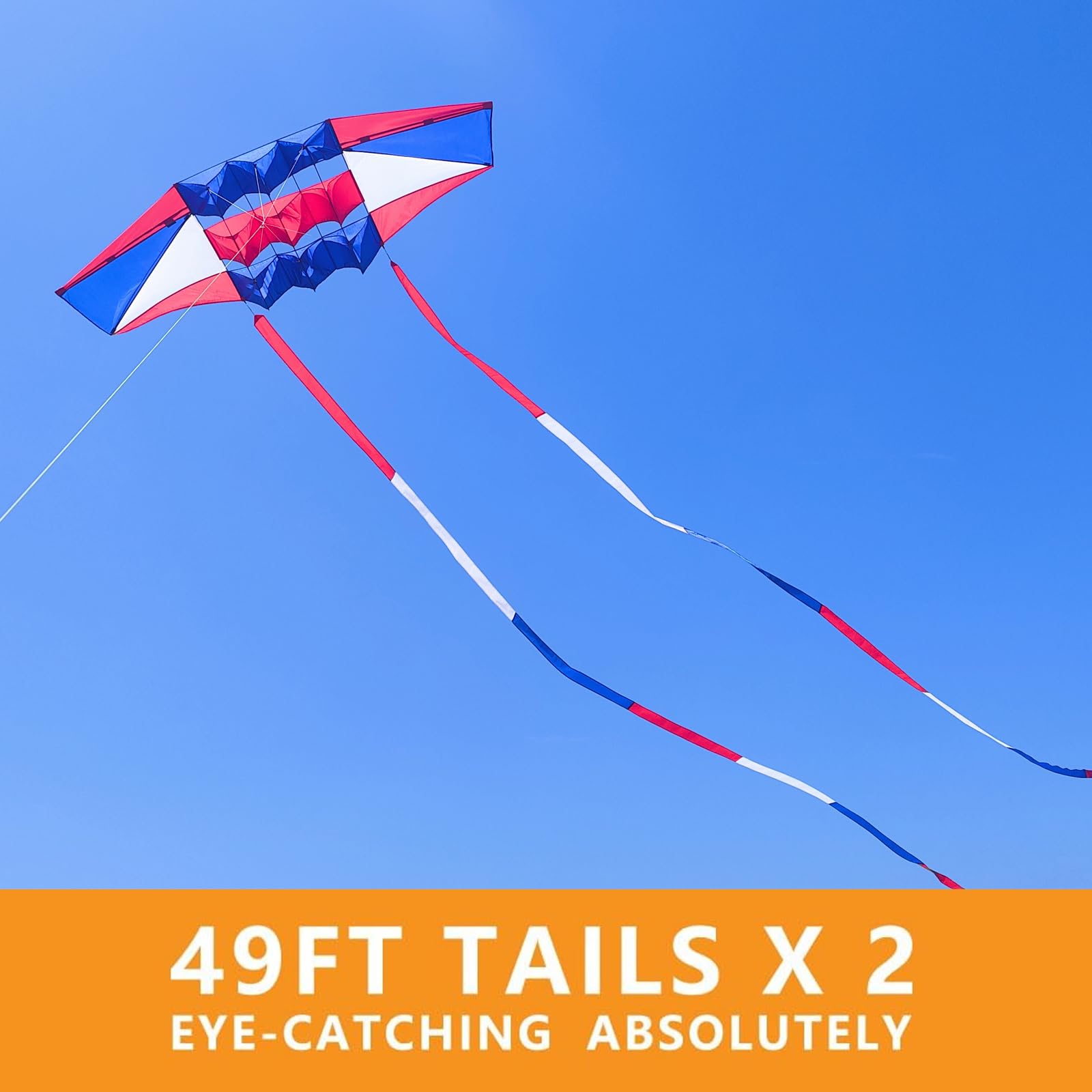 - Q: What size is the Beach Kite, and what accessories are included? A: The Beach Kite measures 98 inches in length and 31 inches in width. It comes with 49 feet of twin long tails, a 300 ft kite string, and a handle, all included for your convenience.