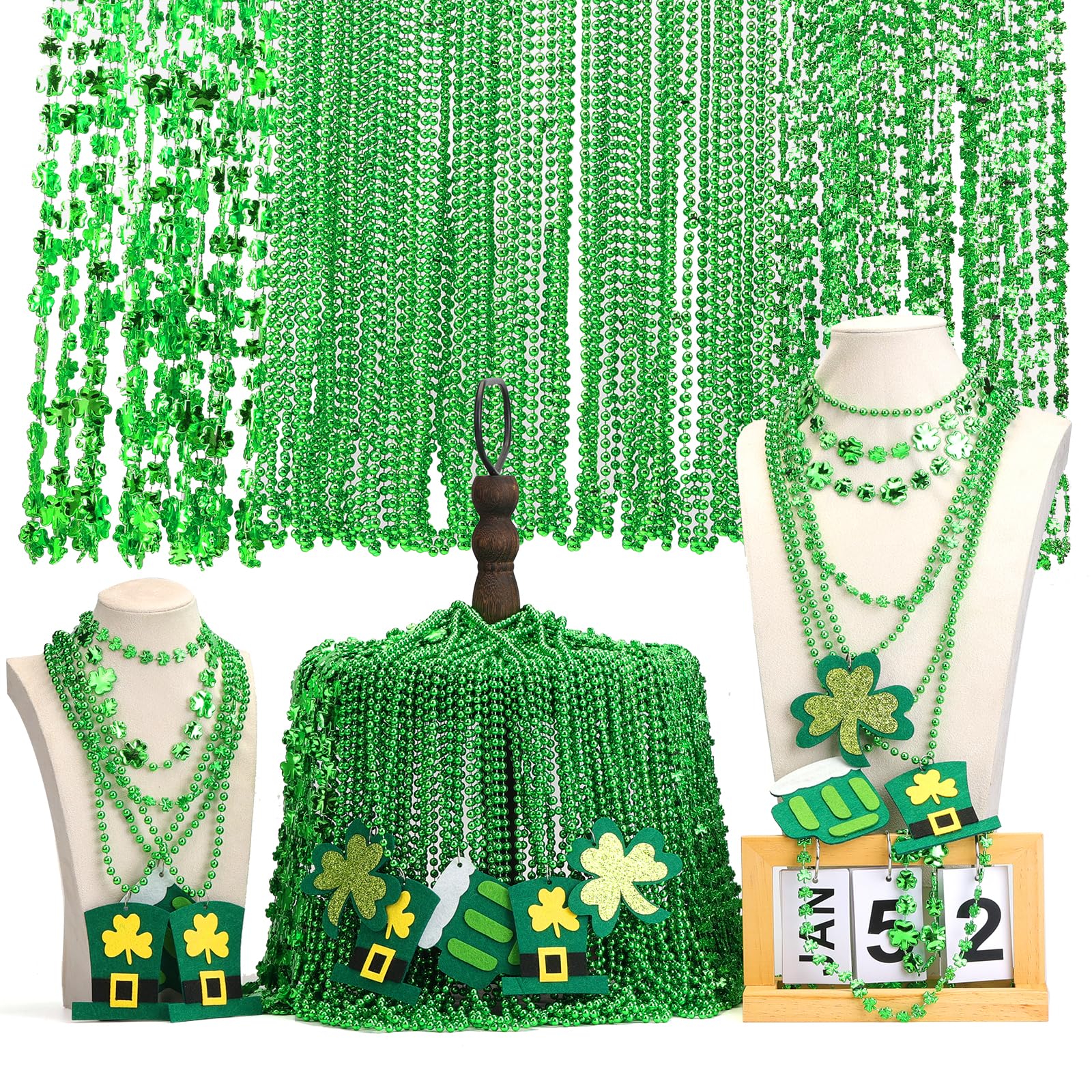 Becfupo 196Pcs St. Patrick's Day Accessories: 100 Pcs Metallic Green Beaded Necklaces & 96 Pcs Temporary Tattoo Stickers - Irish
