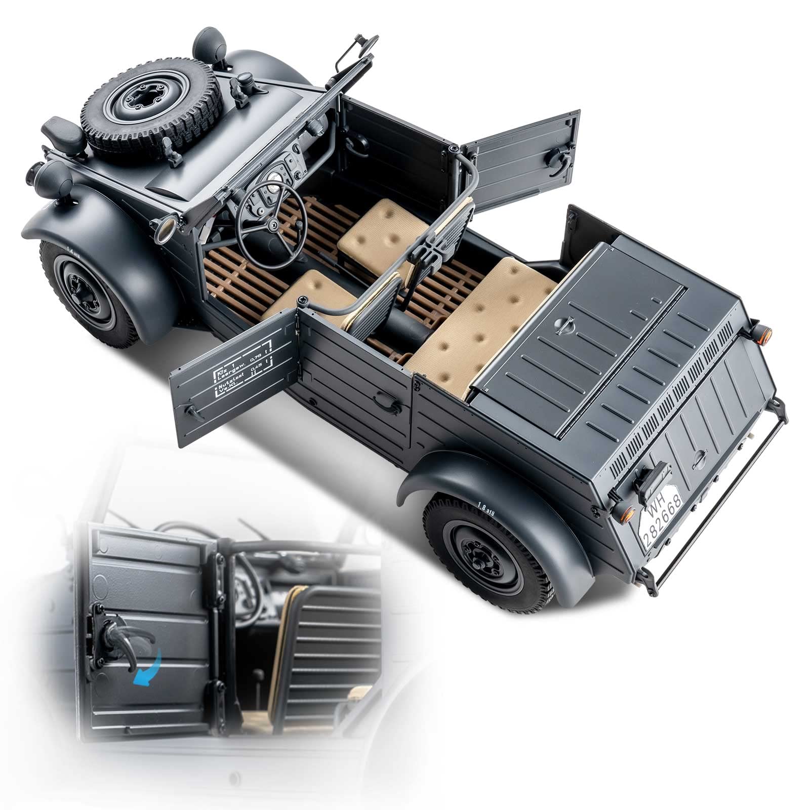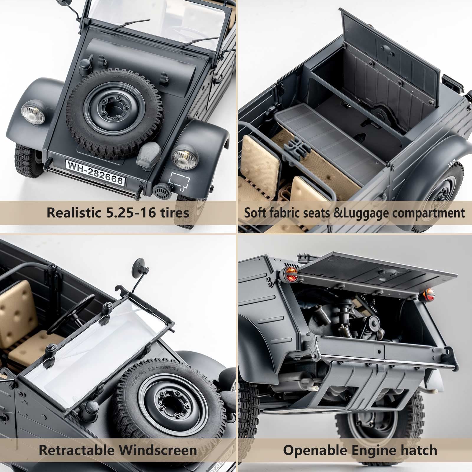 - Q: What makes the BEEZRC RocHobby Type 82 Kubelwagen a unique RC car? A: The BEEZRC RocHobby Type 82 Kubelwagen is an exquisite exact replica of the iconic Kübelwagen, featuring intricate details like openable doors, a fully restored engine, and realistic tire designs, making it a perfect choice for collectors and hobbyists alike.