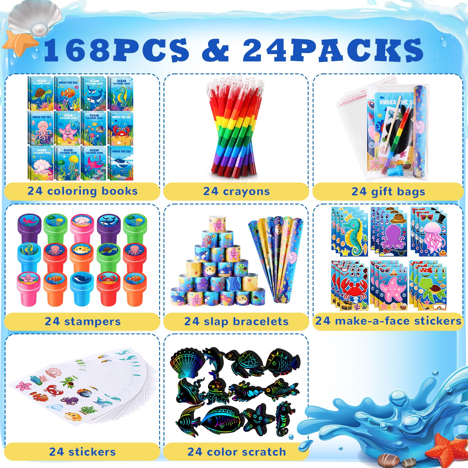 Features: Creative design: Inspired by our cute element for sea, the design is original and other attractive elements are added, the overall style is cute and interesting, children will love it very much, suitable for party activities. Gifts for kids: These sea party favors assortment set for kids are more suitable for kids because the fun designs are enough to catch their eyes. Kids will be delighted when you gift these ocean animals mini coloring books .Also great as a sea goodie bag gift, school teacher rewards, goodie bag stuffers, pinata fillers. Specifications: Material: paper and paraffin and plastic Color: as picture shown Package includes: 24 x Under the Sea mini coloring books 24 x Under the Sea Stacking Crayons 24 x Under the SeaSlap bracelets 24 x Under the Sea stampers 24 x Under the Sea stickers 24 x Under the Sea make-a-face stickers 24 x Under the Sea color scratch 24 x clear gift bags Warm notes: Please allow slight size error due to manual measurement. The color may exist slight difference due to different screen display.