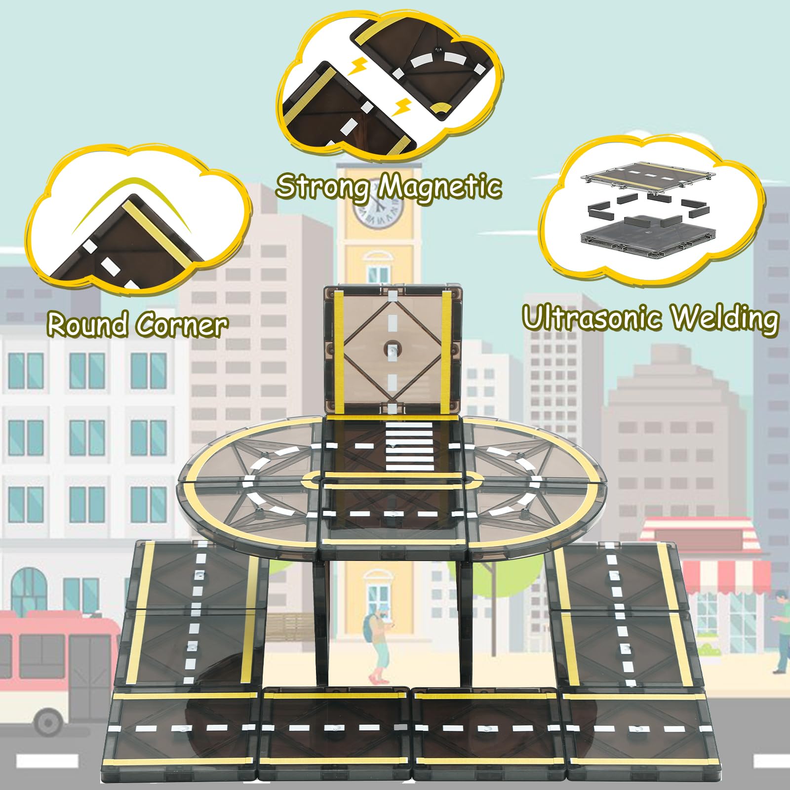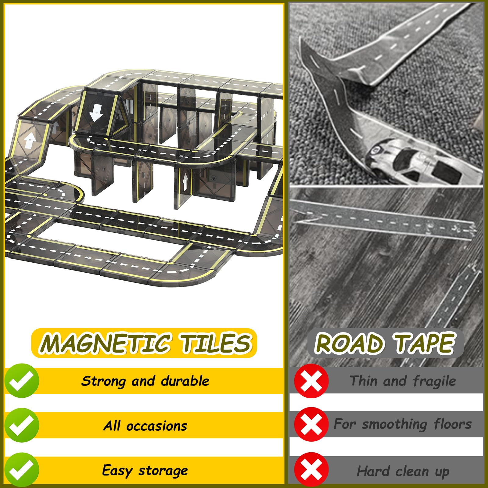 - Q: How do the magnetic tiles promote STEM learning for kids? A: The BENOKER Magnetic Tiles Road Set encourages imaginative play and cooperative construction, helping children develop STEM skills by designing and building unique pathway structures and complex road systems.