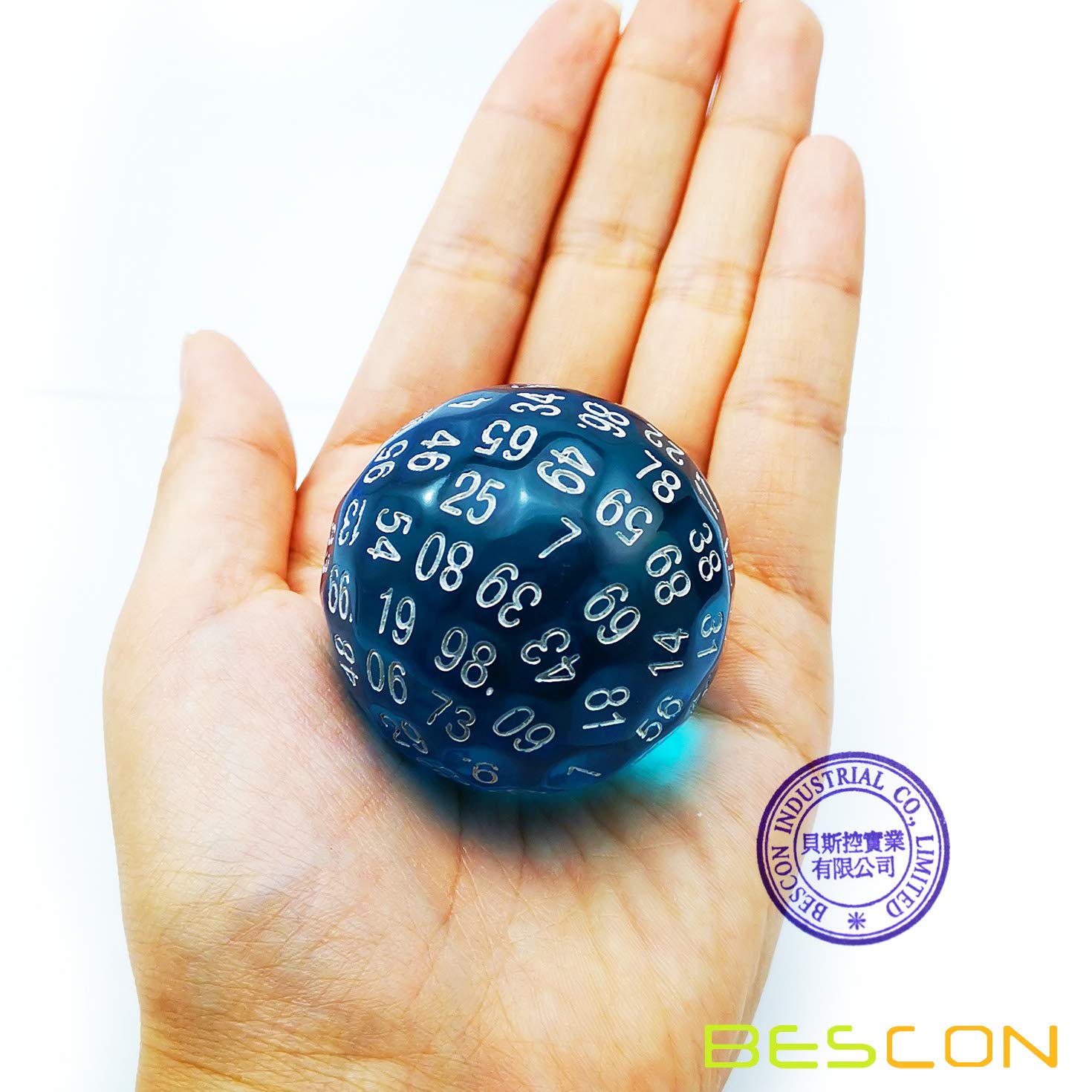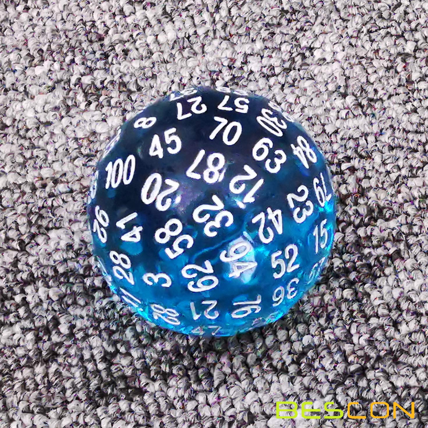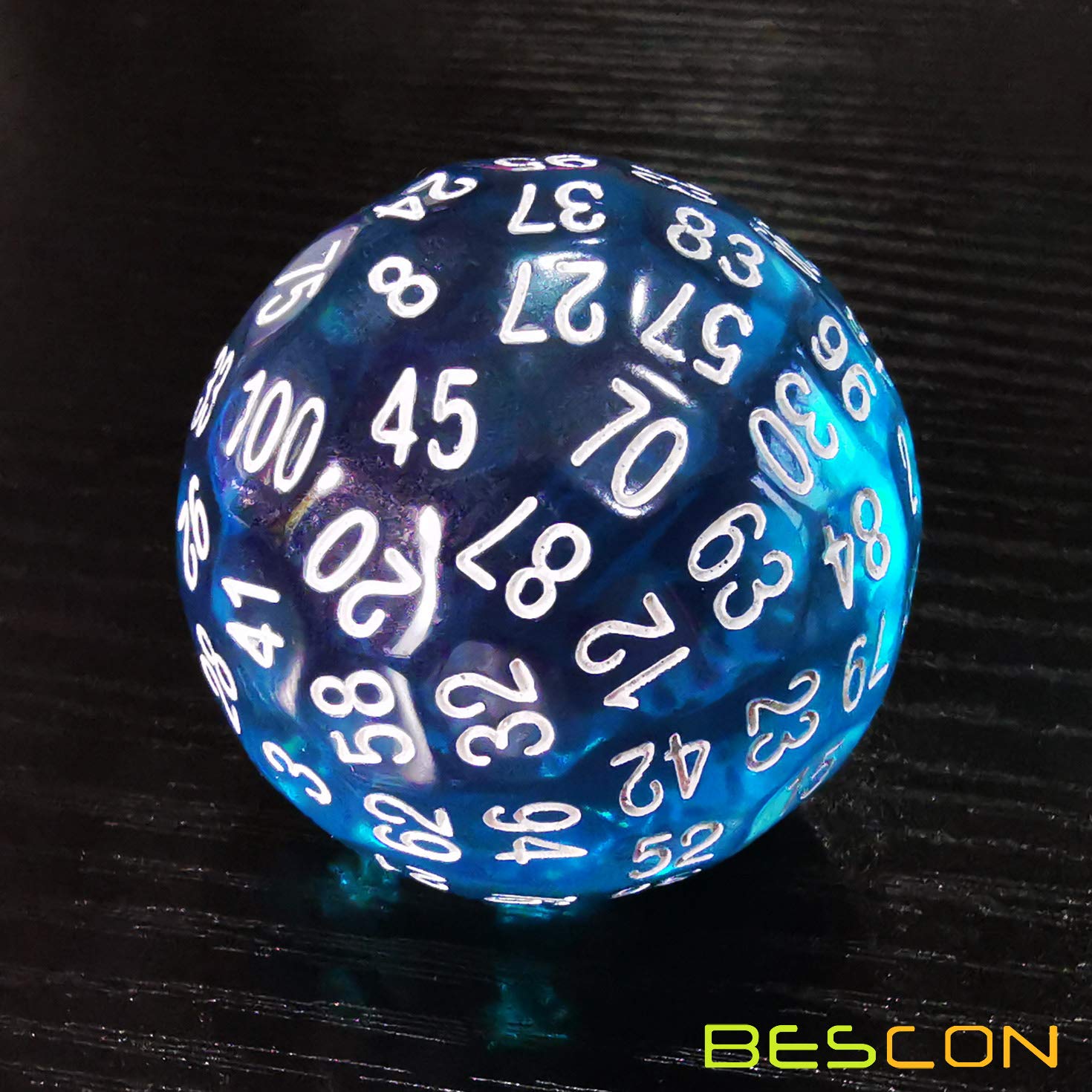 BESCON DICE Translucent Blue D100 Polyhedral Dice, 100 Sided Cube, 45mm Transparent Game Dice for RPGs and Tabletop Games