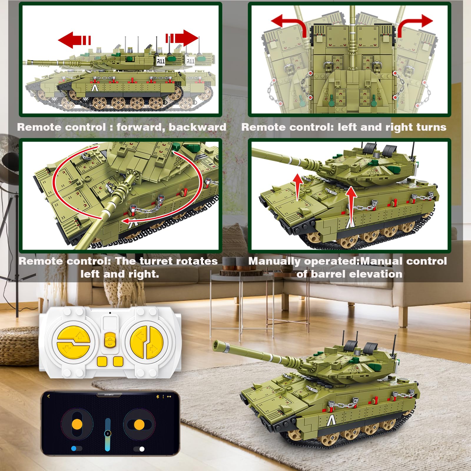 • Q: How does the remote control feature work on this tank building set? A: The remote control feature allows you to maneuver the tank forward, backward, turn, and rotate the turret, providing an interactive experience that enhances playtime and engagement.