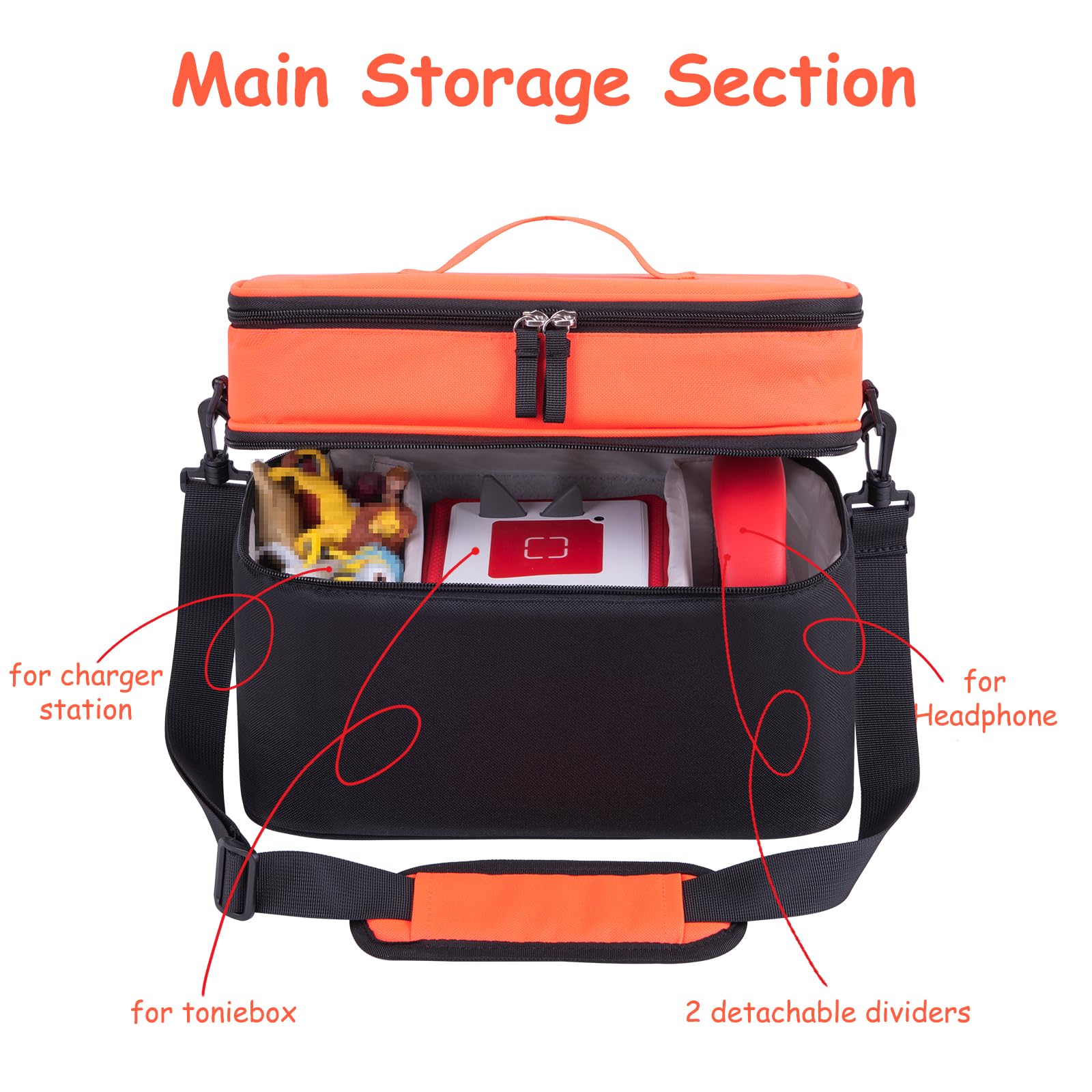 Carrying Bag for Toniebox, Tonies Figures, Headphone & Charging Station No bad smell, with raw material of fabric. Main section for toniebox, tonies characters, headphone & charging station, top mesh pockets for up to 8 tonies figures. 2 zip pockets beside to air voice out & space for 1-2 characters This carrier storage bag will be a great travel companion for your kids music box & tonies wherever youre out on a picnic or during a trip. Detachable shoulder strap for convenient carrying experience.