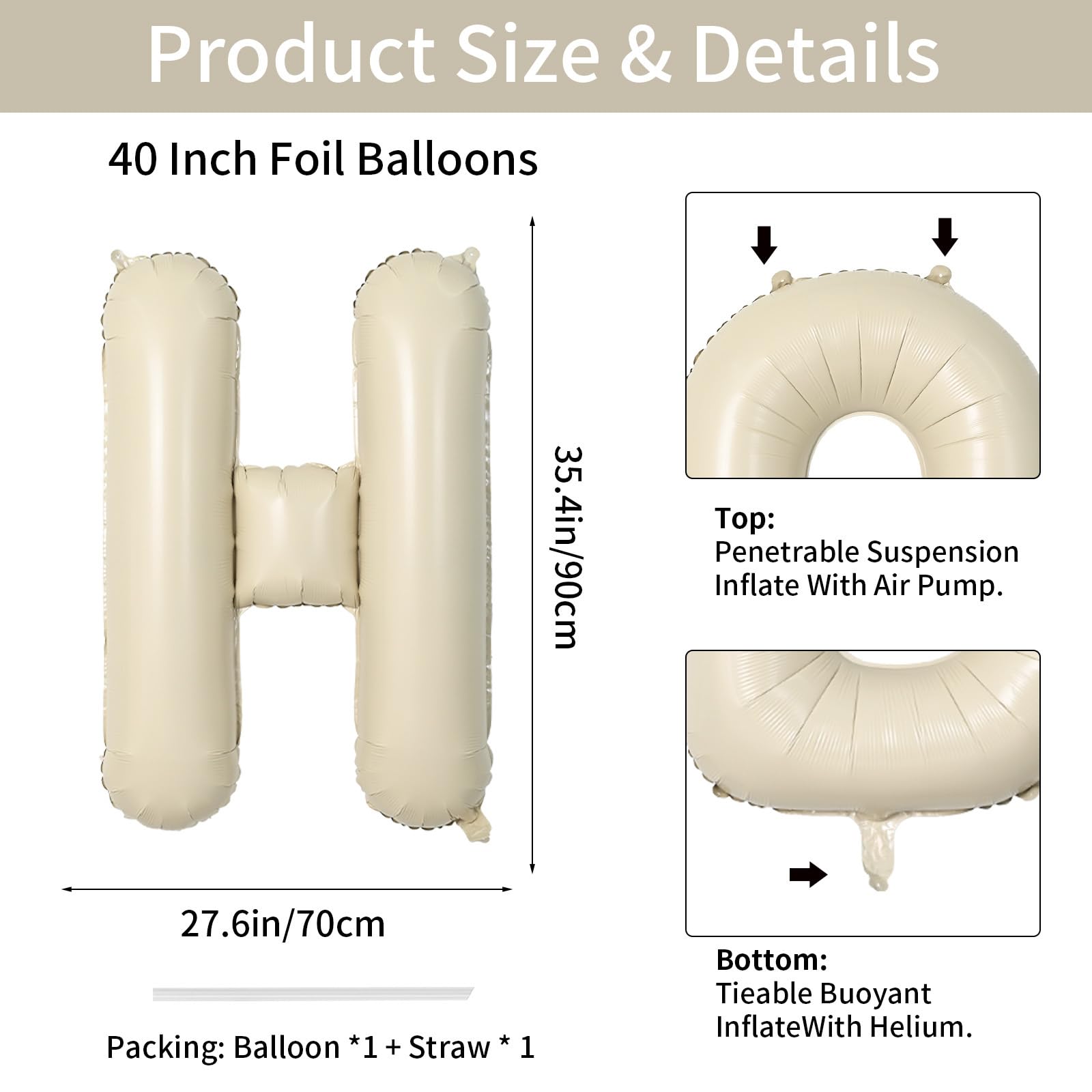 Biapian 40 Inch Letter H Balloons, Giant Cream H Foil Balloon, Big Single Alphabet A-Z Balloons, Beige Large Aluminum H Balloons