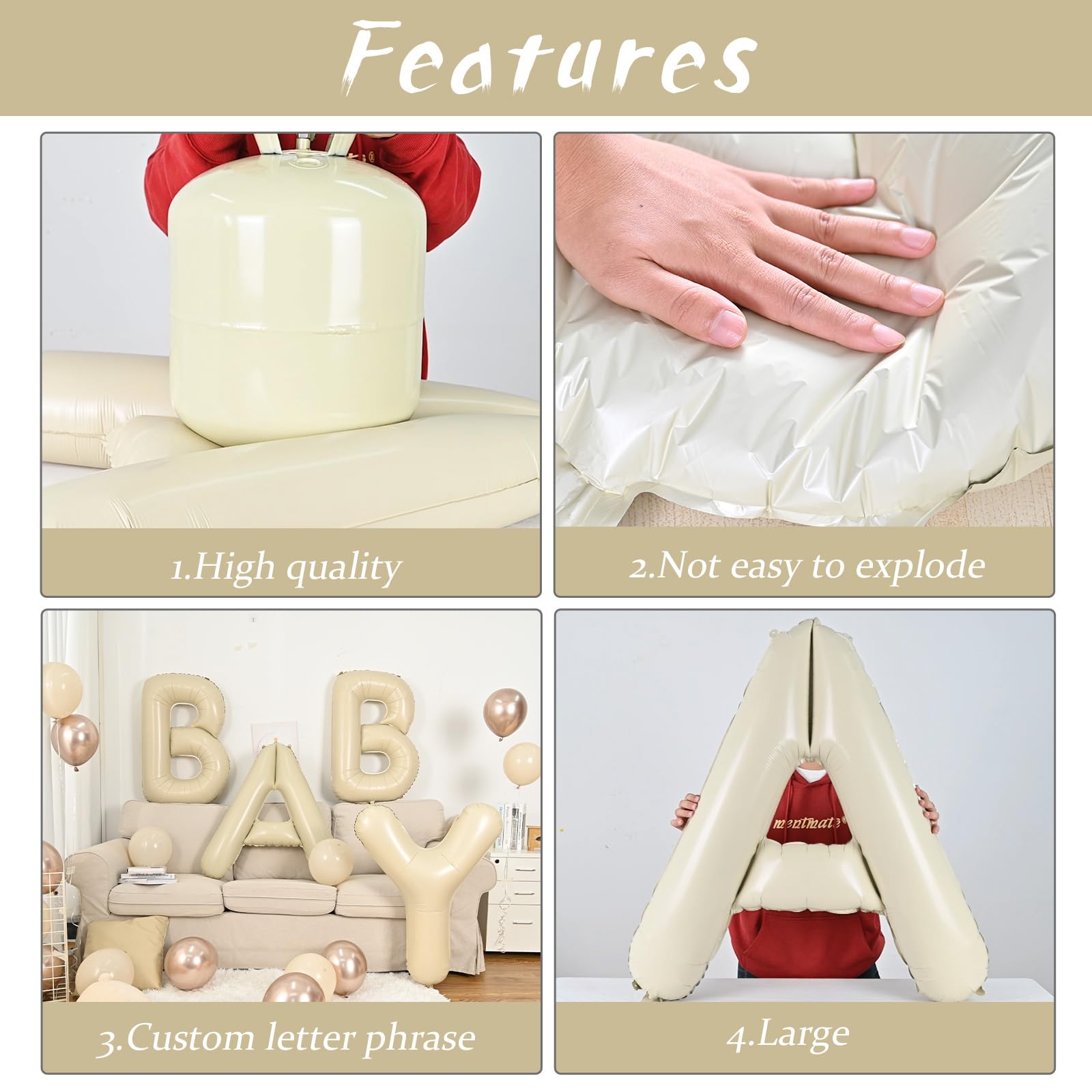 - Q: How do I inflate the giant cream M foil balloon? A: You can inflate the M foil balloon with either air or helium. It is recommended to fill it to 85%-90% capacity to prevent over-expansion and bursting. The valve seals automatically, and you can release the gas using a plastic straw for easy deflation.
