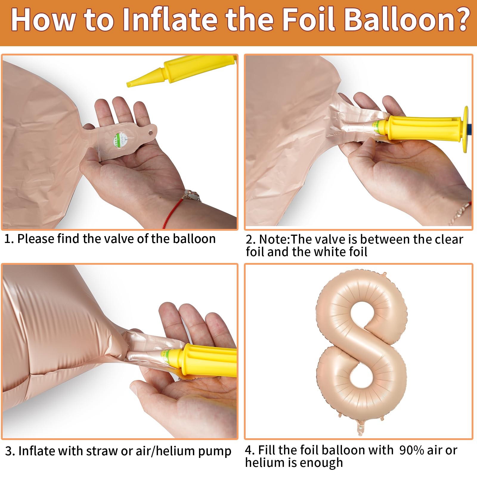 - Q: How do I properly inflate the foil balloons? A: You can inflate the foil balloons with either air or helium. It's recommended to fill them to 85%-90% to prevent over-expansion. The built-in valve seals automatically, eliminating the need for knots, and you can release the gas using a plastic straw.