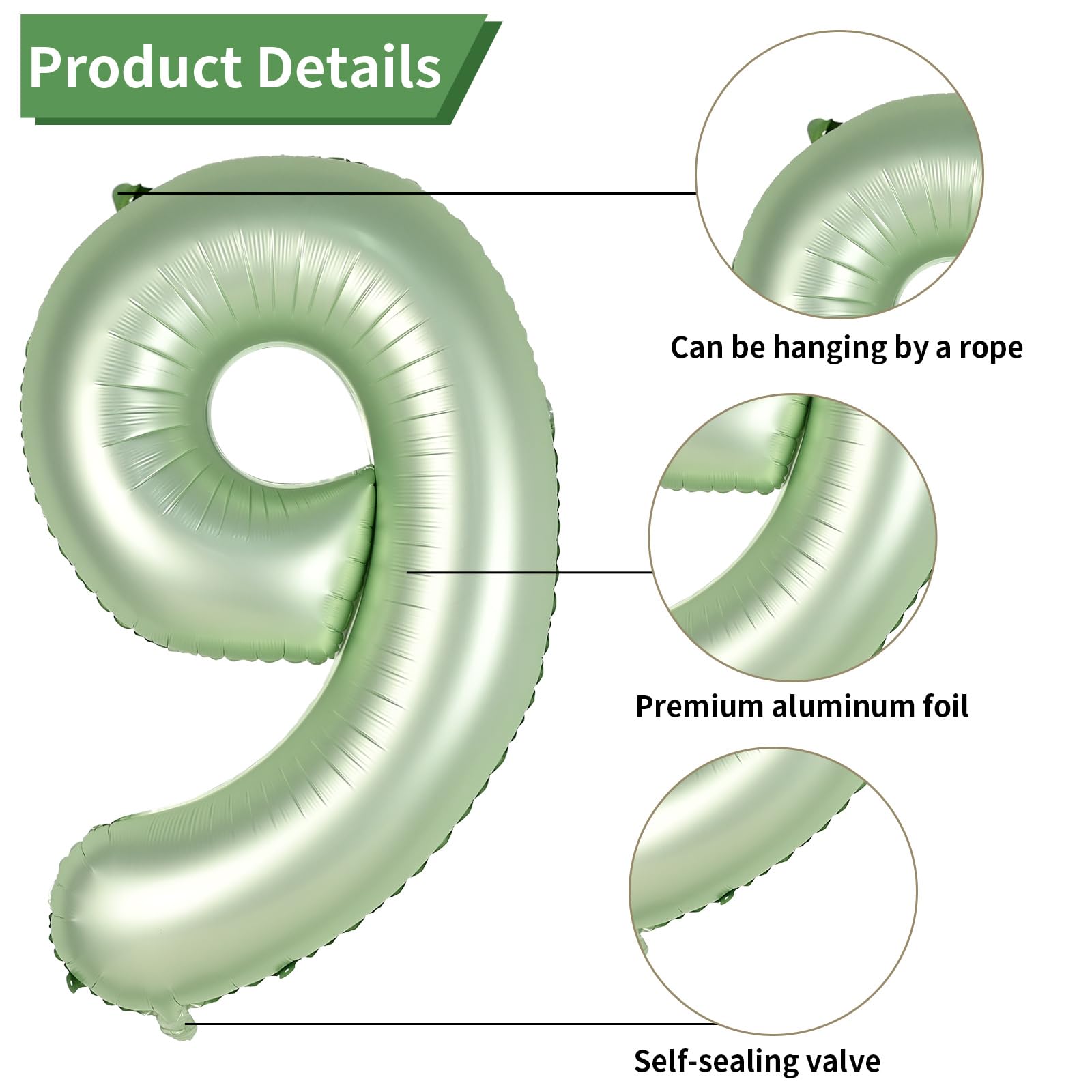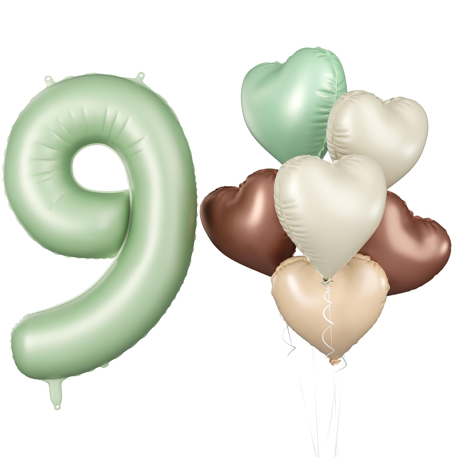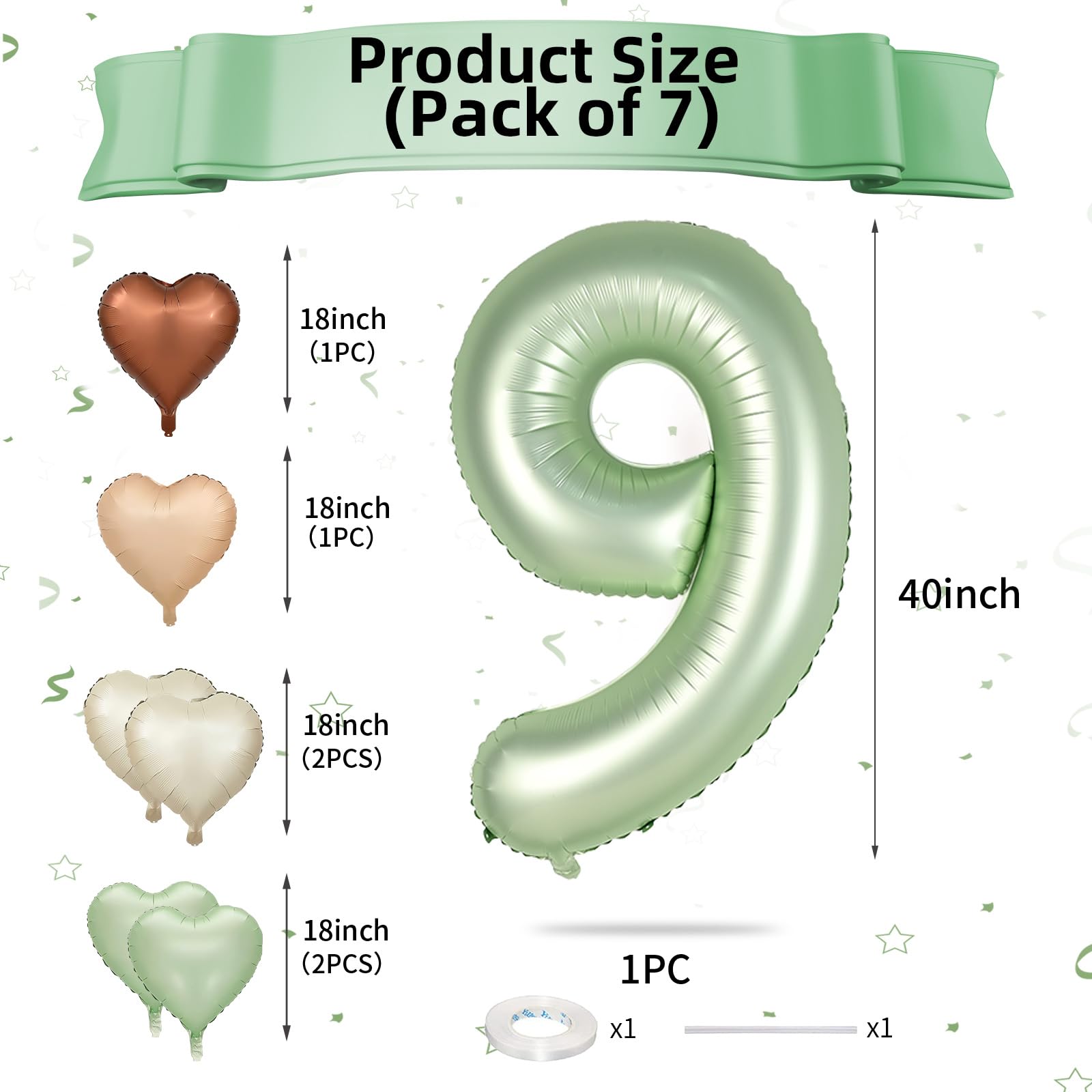 Number Balloons 7 Pack ?? Package Includes 1 X 40 Inch Sage Green Number Balloons 2 X 18 Inch Cream Heart Balloons 2 X 18 Inch Sage Heart Balloons 1 X 18 Inch Light Brown Heart Balloons 1 X 18 Inch Brown Heart Balloons ?? Specification - Durable And Safe - Simple To Use - Made In High Quality Foil - Perfect For Any Theme Party, Birthday Party, Baby Shower, Wedding Party. ?? Perfect For Any Scene Pairing The Number Balloon With Heart-Shaped Balloons Of The Same Color, Creating The Highly Sought-After Ins Style That Serves As An Ideal Backdrop For 9Th Birthday And 9Th Anniversary Celebrations. Number Balloons Have Countless Combinations For Your Remarkable Events: Baby Shower Balloons, Jungle Balloons, Gender Reveal Balloons, Graduation Balloons, Birthday Party Balloons, Valentines Day Balloons, New Year Balloons, Halloween Balloons, Christmas Balloons, Ect. ?? Creating The Perfect Foil Decorations 1. You Can Use These Number Heart Balloons To Mix And Match With Other Colors. 2. We Offer Number Balloons From 0-9 For Your Selection, And You Can Combine Two Sets To Create Your Desired Number. ?? How To Use Foil Balloons 1.These Foil Balloons Can Be Filled With Air Or Helium. 2.The Valve Seals Automatically When Inflated Without The Need For An Extra Knot, And The Internal Gas Can Be Released With A Plastic Straw 3.For A Floating Effect, They Can Be Inflated With Helium. ?? Warm Tips 1. Don'T Blow Up The Chrome Foil Balloon Too Much. The Balloon Can Be Inflated With Helium And Air, Just Fill In 85%-90%. 2. Avoid Sun Exposure, Sharp Objects, Excessive Friction. 3. There Will Be A Certain Color Difference Before And After The Balloon Is Inflated, And The Effect Is Different Under Different Light. 4. Due To The Display Of The Monitor, The Color May Be Slightly Different From The Actual Item.