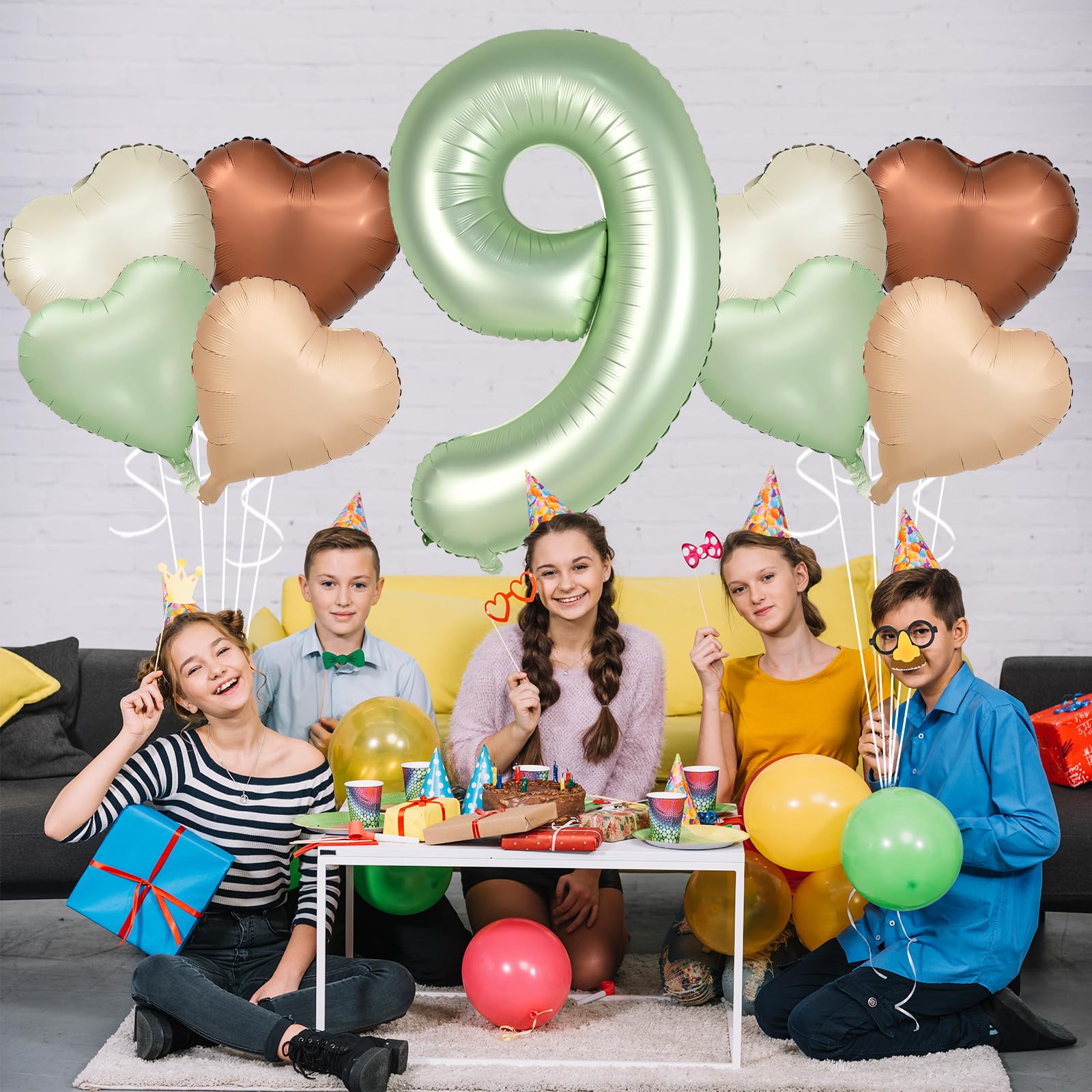Biapian 40 Inch Sage Green Number 9 Balloons, Gaint Number 9 Balloon With 18'' Retro Foil Heart Balloons Helium For Neutral Boys