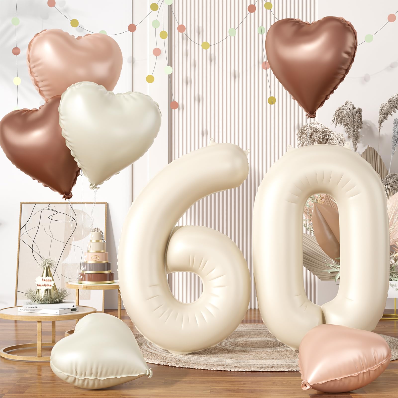 Number Balloons 8 Pack ?? Package Includes 2 X 40 Inch Cream Number Balloons 2 X 18 Inch Cream Heart Balloons 2 X 18 Inch Light Brown Heart Balloons 2 X 18 Inch Brown Heart Balloons ?? Specification - Durable And Safe - Simple To Use - Made In High Quality Foil - Perfect For Any Theme Party, Birthday Party, Baby Shower, Wedding Party. ?? Perfect For Any Scene Pairing The Number Balloon With Heart-Shaped Balloons Of The Same Color, Creating The Highly Sought-After Ins Style That Serves As An Ideal Backdrop For 60Th Birthday And 60Th Anniversary Celebrations. Number Balloons Have Countless Combinations For Your Remarkable Events: Baby Shower Balloons, Gender Reveal Balloons, Graduation Balloons, Birthday Party Balloons, Valentines Day Balloons, New Year Balloons, Halloween Balloons, Christmas Balloons, Ect. ?? Creating The Perfect Foil Decorations 1. You Can Use These Number Heart Balloons To Mix And Match With Other Colors. 2. We Offer Number Balloons From 0-9 For Your Selection, And You Can Combine Two Sets To Create Your Desired Number. ?? How To Use Foil Balloons 1.These Foil Balloons Can Be Filled With Air Or Helium. 2.The Valve Seals Automatically When Inflated Without The Need For An Extra Knot, And The Internal Gas Can Be Released With A Plastic Straw 3.For A Floating Effect, They Can Be Inflated With Helium. ?? Warm Tips 1. Don'T Blow Up The Chrome Foil Balloon Too Much. The Balloon Can Be Inflated With Helium And Air, Just Fill In 85%-90%. 2. Avoid Sun Exposure, Sharp Objects, Excessive Friction. 3. There Will Be A Certain Color Difference Before And After The Balloon Is Inflated, And The Effect Is Different Under Different Light. 4. Due To The Display Of The Monitor, The Color May Be Slightly Different From The Actual Item.