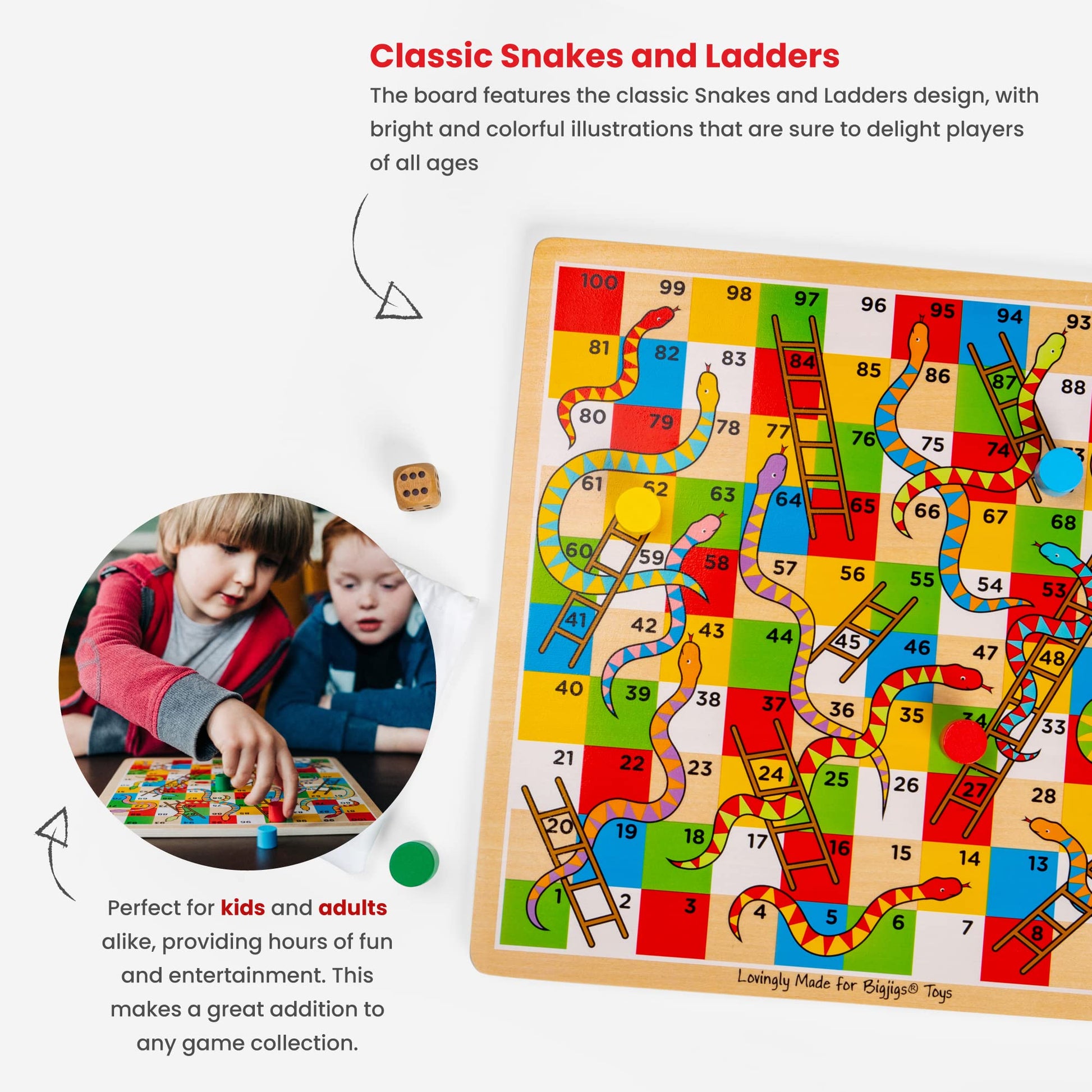 Bigjigs Toys Traditional Snakes and Ladders Game - Quality Snake and Ladders Family Games for Kids and mature-themeds Up to 4 Players Board Game Includes Counters & Dice