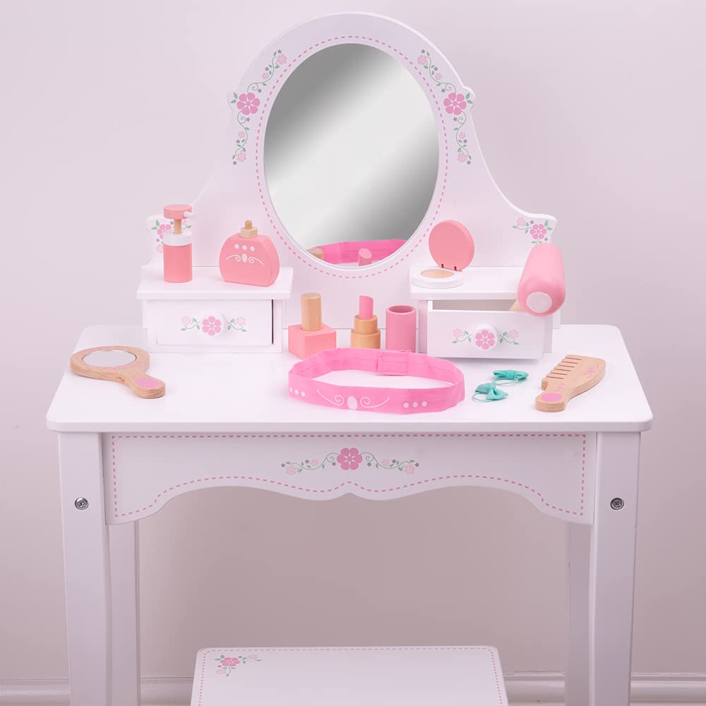 • Q: How does the vanity playset help with child development? A: The Bigjigs Toys vanity playset encourages imaginative role play, which can enhance communication skills, concentration, hand-eye coordination, and fine motor skills as children imitate real-life beauty routines.