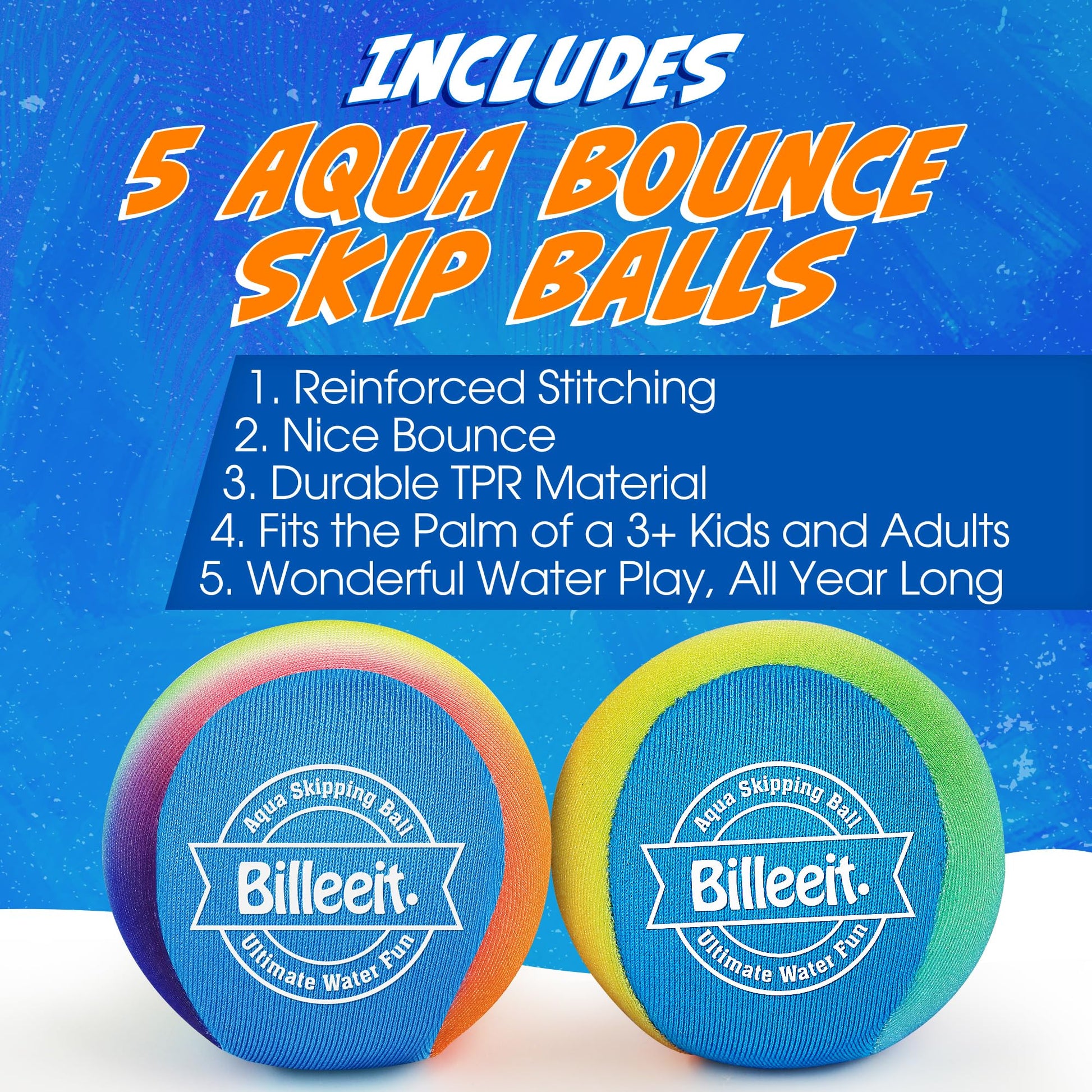 View compareBilleeit 5Pcs Water Skipping Balls for Pool Play, Rainbow Color Splash Water Bouncing Balls with Portable Mesh Bag, Fun Beach To