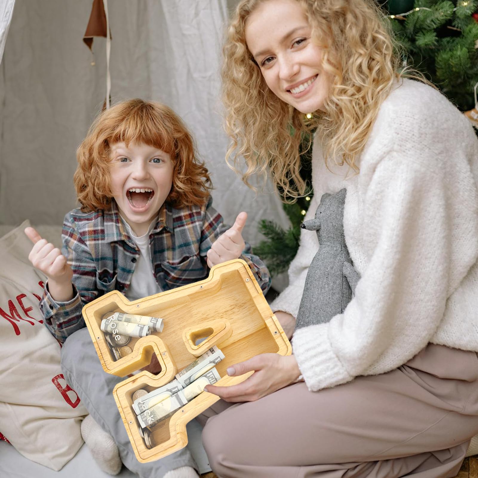 Bitreeworks Letter Piggy Bank, Personalized Wooden Coin Banks, Large Wood Money Peny Bank for Adults (9'', Alphabet E)