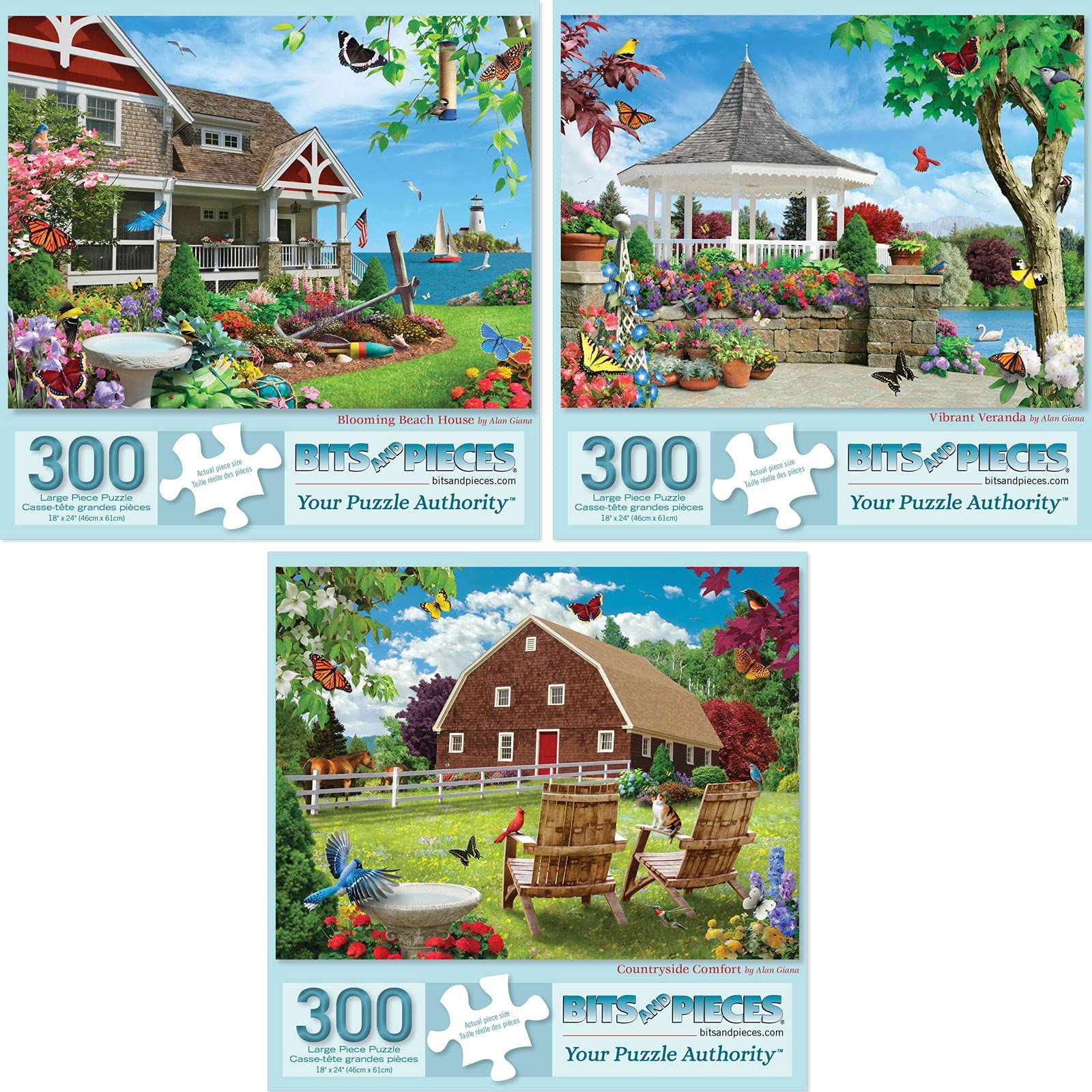 Value Set of Three (3) 300 piece Vibrant Veranda, Blooming Branch House, Countryside Comfort, Flowers Summer jigsaw puzzles designed by Alan Giana. Puzzles measure 18' x 24' when completed. Since the 16th century, jigsaw puzzles have been a favorite pastime for all ages. Now, with technological advances, Bits And Pieces has taken jigsaw puzzles to a new level of superior quality and challenging fun. Every original Bits And Pieces jigsaw puzzle is made with ultra-heavy weight board and cut with quality random puzzle dies with fully interlocking pieces for a secure fit. At Bits And pieces, we believe that every truly exceptional jigsaw puzzle starts with the work of a truly exceptional artist. We understand what it takes to make a great puzzle. The kind that challenges rather than frustrates, where each area has depth and detail that unfold into a larger beauty. Bits and Pieces commissions original artwork by artists from around the world to create imaginative artwork that puzzlers like you are looking for in a wide variety of puzzle sizes and styles for any age or ability. We know every puzzler is different, so every Bits And Pieces original puzzle is manufactured in two different piece counts, ranging from 100 pieces to 2000 pieces. We also have an innovative collection of specialty puzzles including glow-in-the-dark puzzles, glitter effects puzzles, unique shaped puzzles and puzzles with oversized pieces.