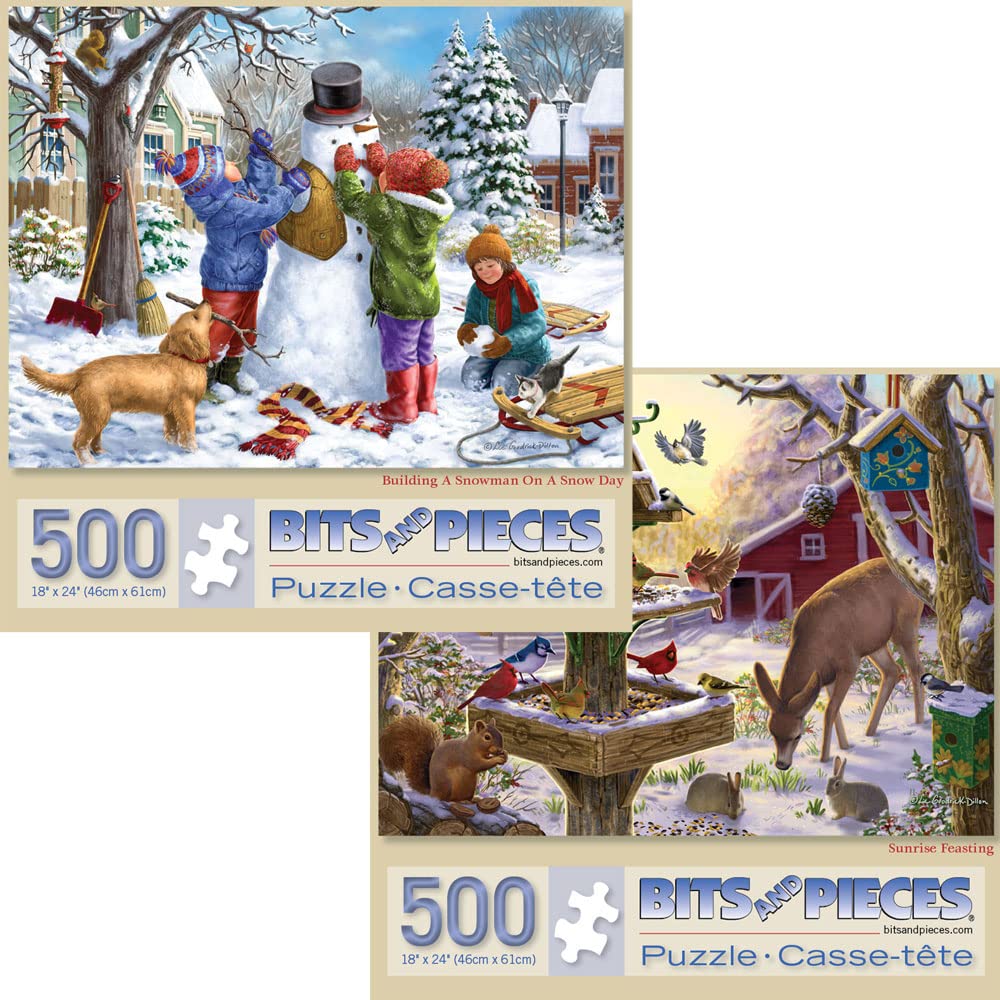 • Q: What makes this jigsaw puzzle set a great gift option? A: The Bits and Pieces value set of two large 500 piece jigsaw puzzles makes an excellent gift for holidays, birthdays, or any special occasion. The intricate designs and high-quality artwork not only provide a fun activity but also create beautiful pieces to display once completed.