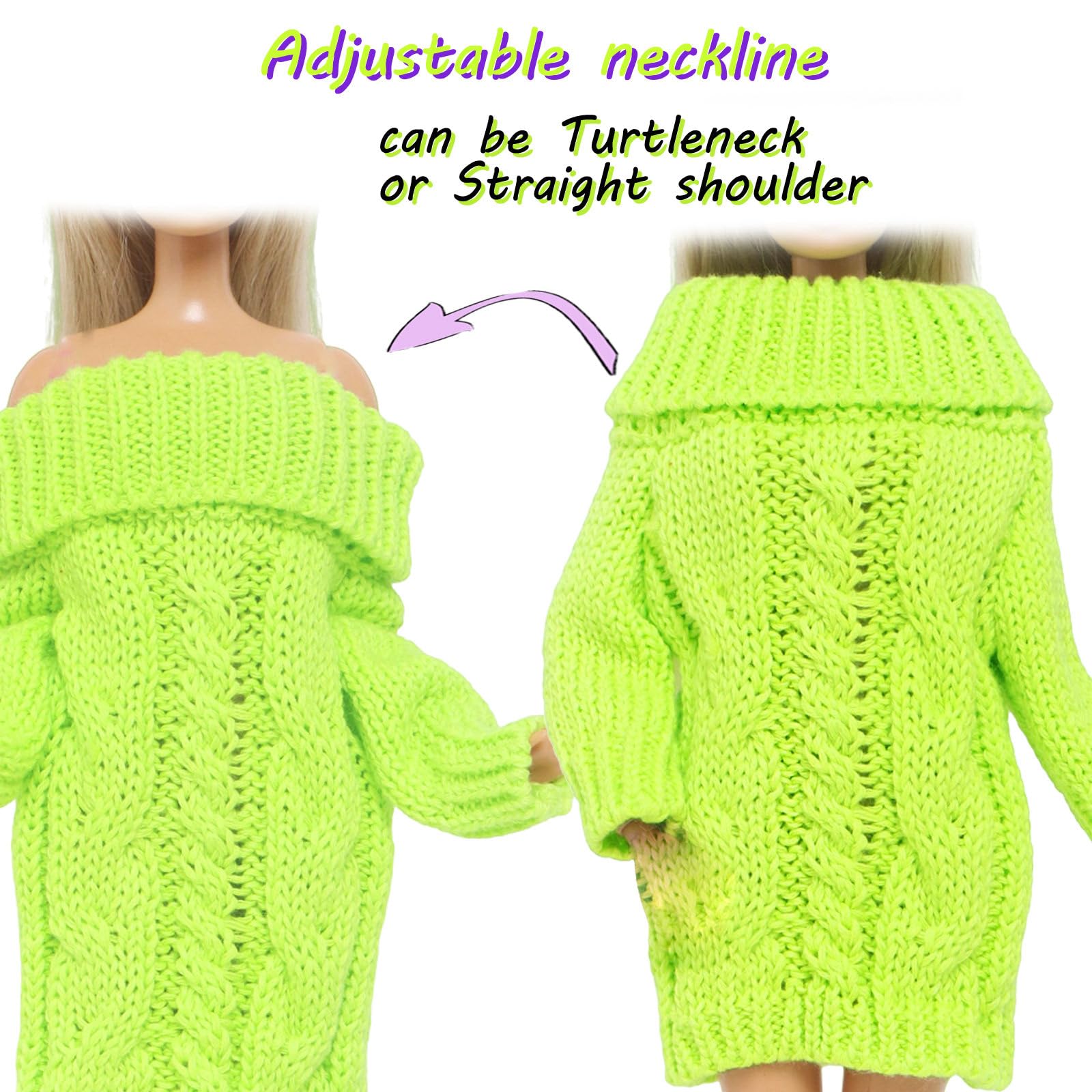 - Q: What unique features does the BJDBUS Winter Turtleneck Sweater have? A: This sweater features a unique fluorescent green color, a loose knee dress design, and two ways to style the collar, allowing for a casual look or an off-shoulder style.