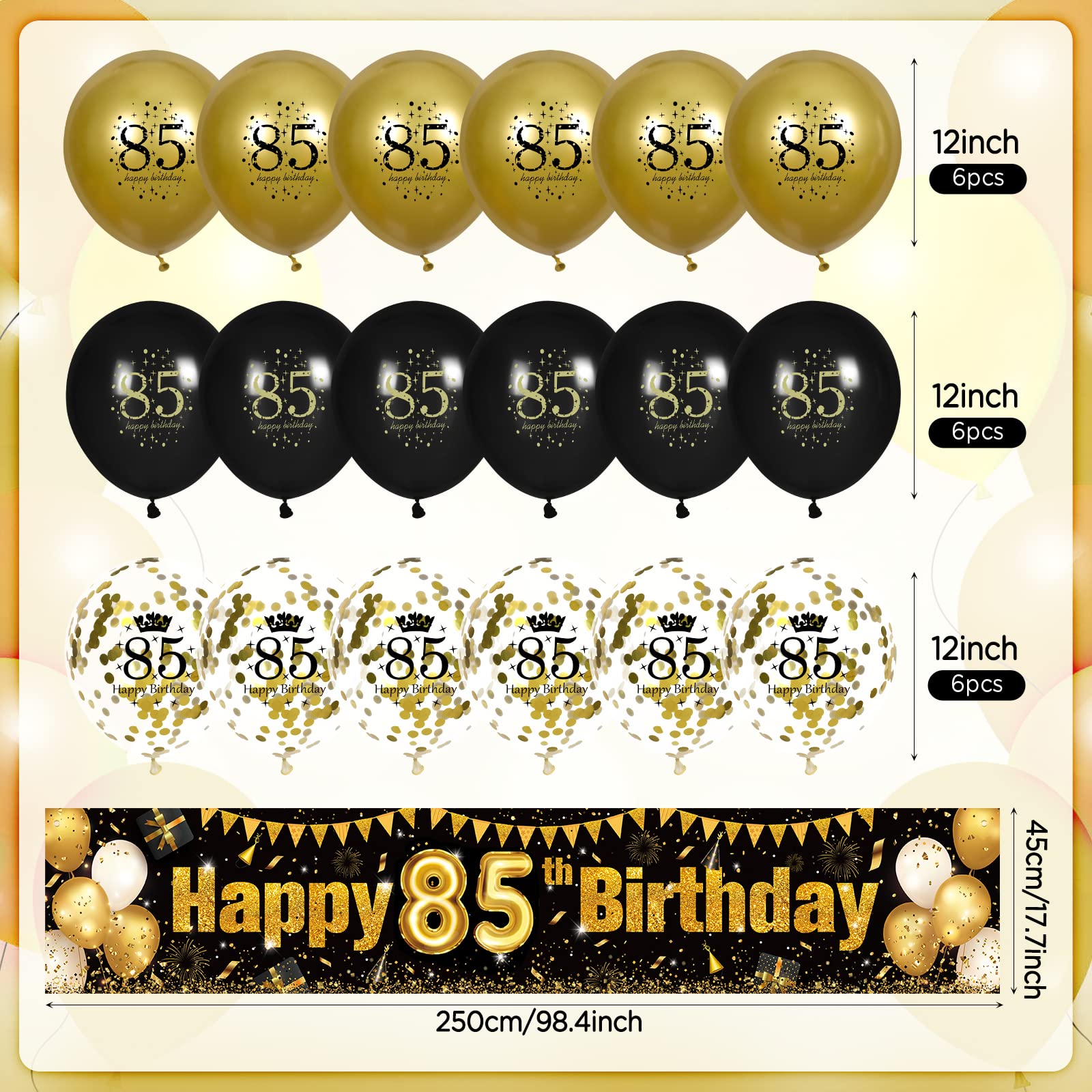 - Q: What is included in the package of the 85th birthday decorations? A: The package includes one black gold 85th Happy Birthday yard banner and 18 latex balloons, which consist of 6 gold balloons, 6 black balloons, and 6 transparent confetti balloons.