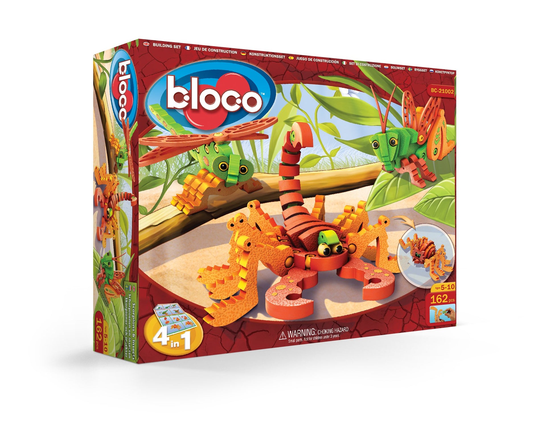 - Q: What is included in the Bloco Toys - Scorpions and Insects set? A: The set includes 116 foam pieces, 46 plastic connectors, and an illustrated instruction sheet. The instructions guide kids in building a Scorpion, Grasshopper, and Dragonfly, providing a structured way to engage with the toy.