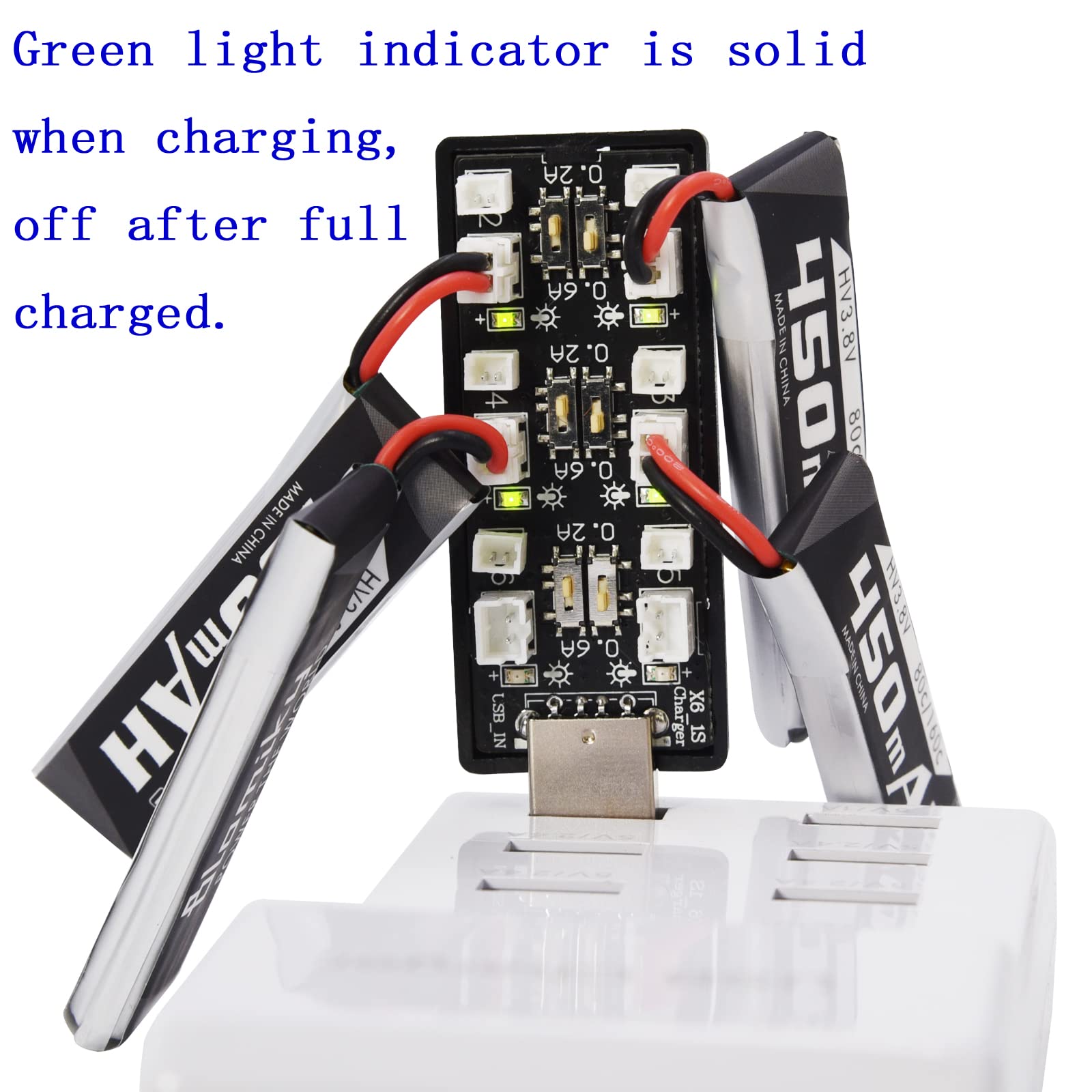- Q: How should I charge the Blomiky 4 Pack Lipo batteries? A: These Lipo batteries can be charged using the included 6 in 1 USB seat charger, which features a green light indicator that remains solid during charging and turns off once the batteries are fully charged.