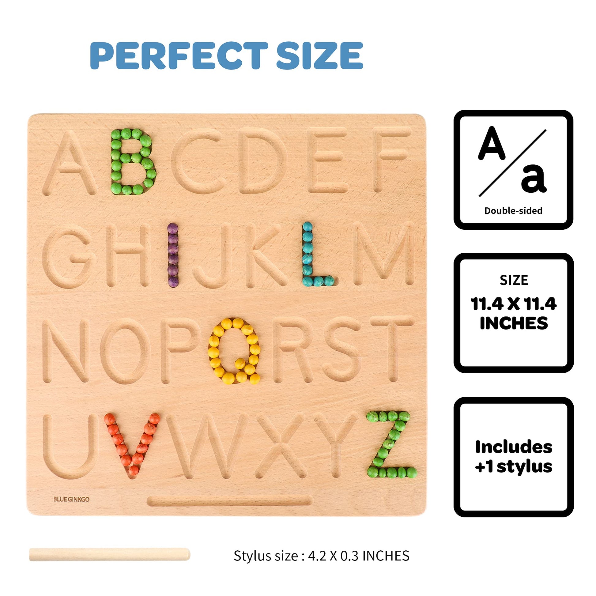 View compareBlue Ginkgo Alphabet Tracing Board – Double-Sided Wooden Montessori Letter Board For Preschool And Toddler Learning, Uppercase And Lowercase Letters (11.4 X 11.4 Inches)